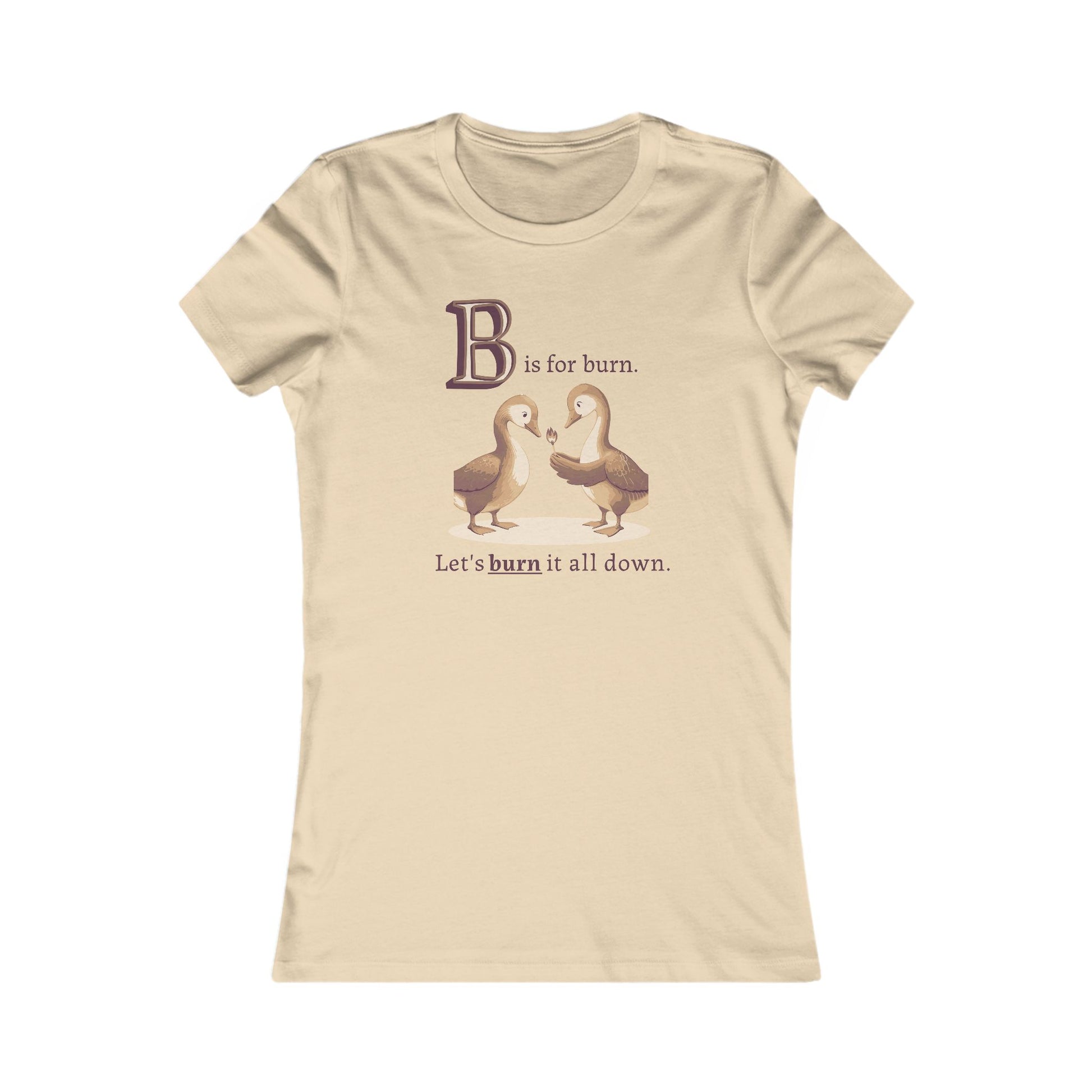 This fitted tee features a bold, deceptively gentle illustration styled like an early-reader book page. Soft visuals, clean layout — and then the words shift the whole tone: