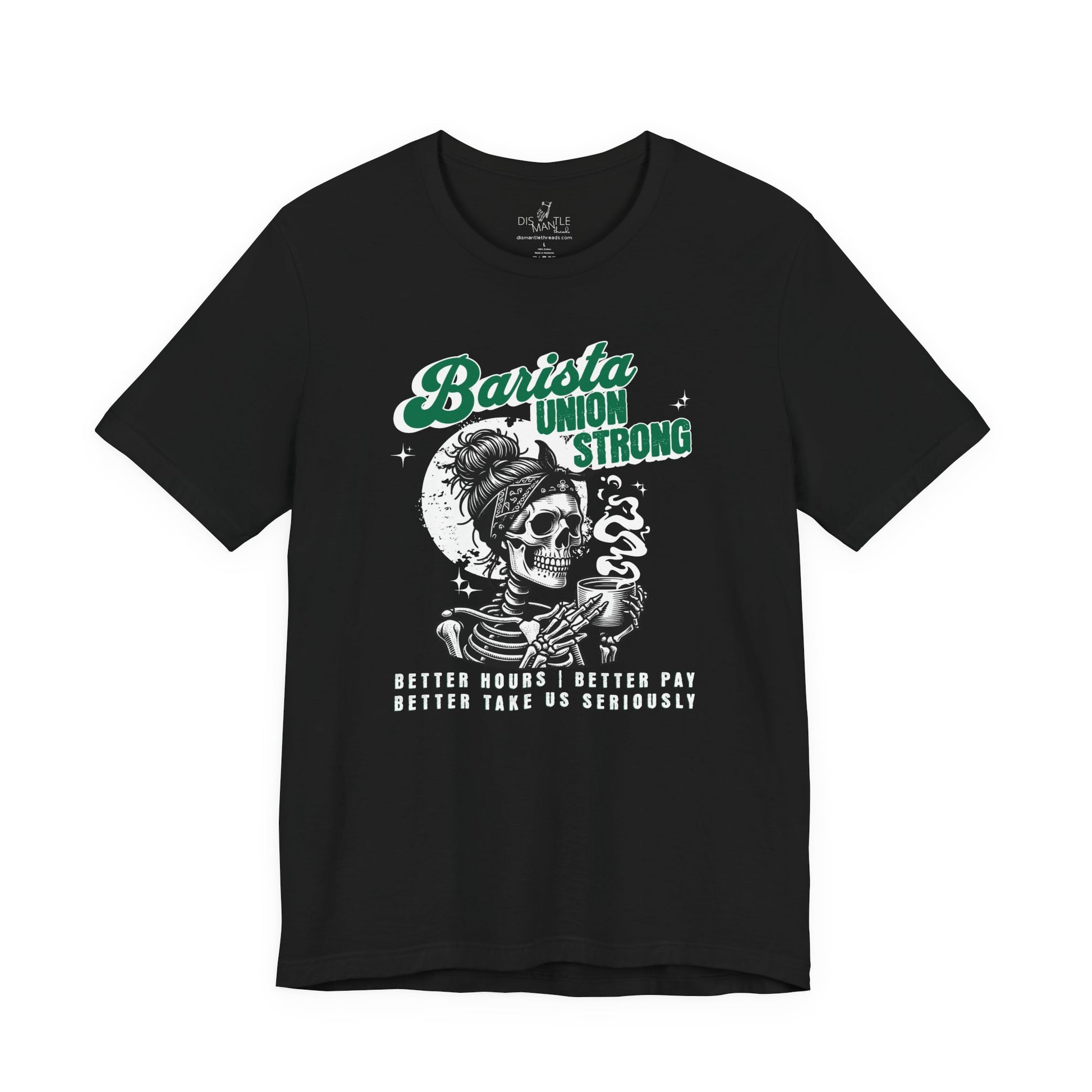 The skeleton is a wink — because burnout is real, but so is collective power. This design is all protest humor and union energy, part of a broader movement of baristas demanding the basics: safe staffing, consistent schedules, and real wages. The fight’s not over. This shirt makes that clear.