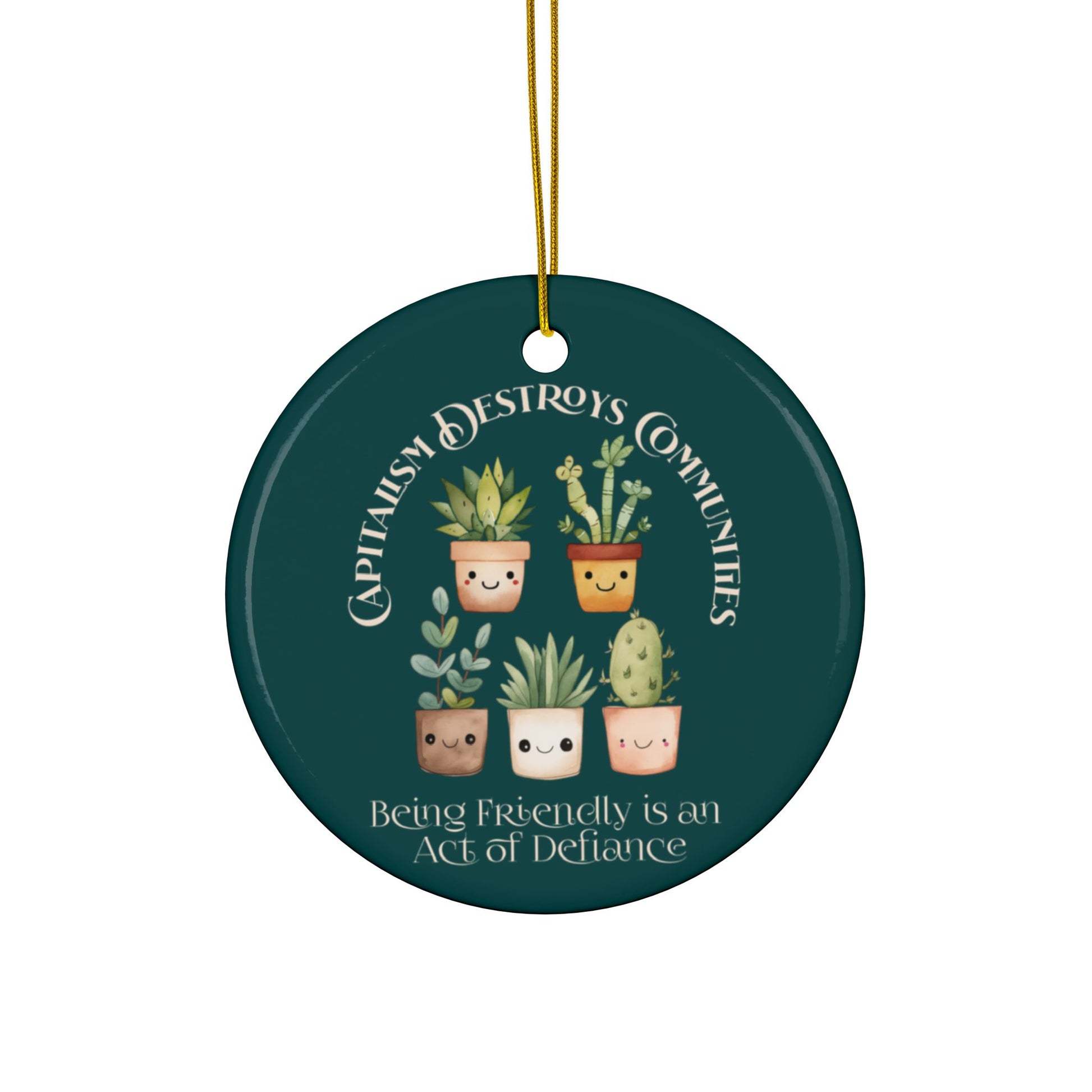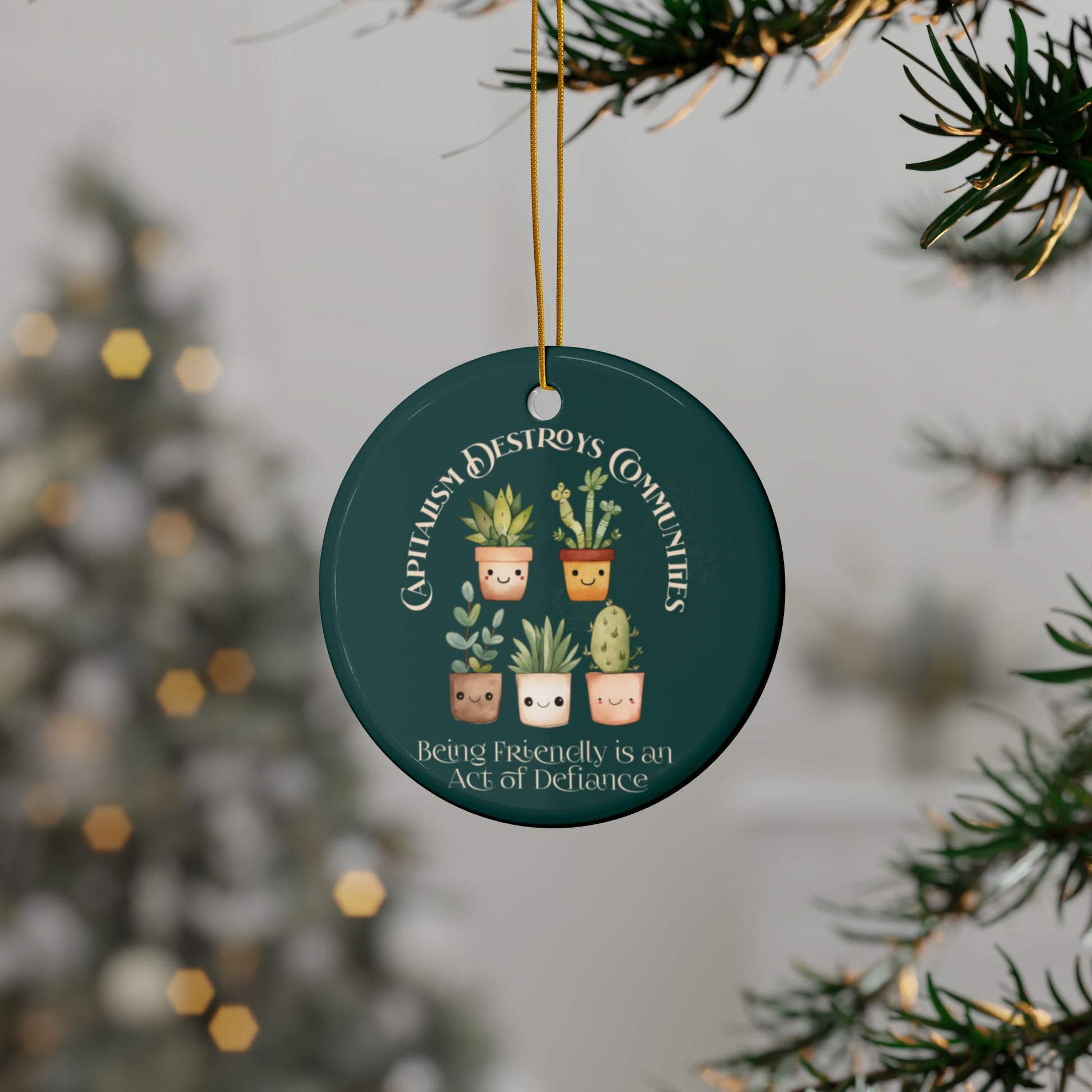 This ornament pairs cheerful, smiling succulents on a deep teal background with the phrases “Capitalism Destroys Communities” and “Being Friendly Is an Act of Defiance.” It’s cute enough to blend into any holiday tree — and pointed enough to make its message clear the moment someone reads it.