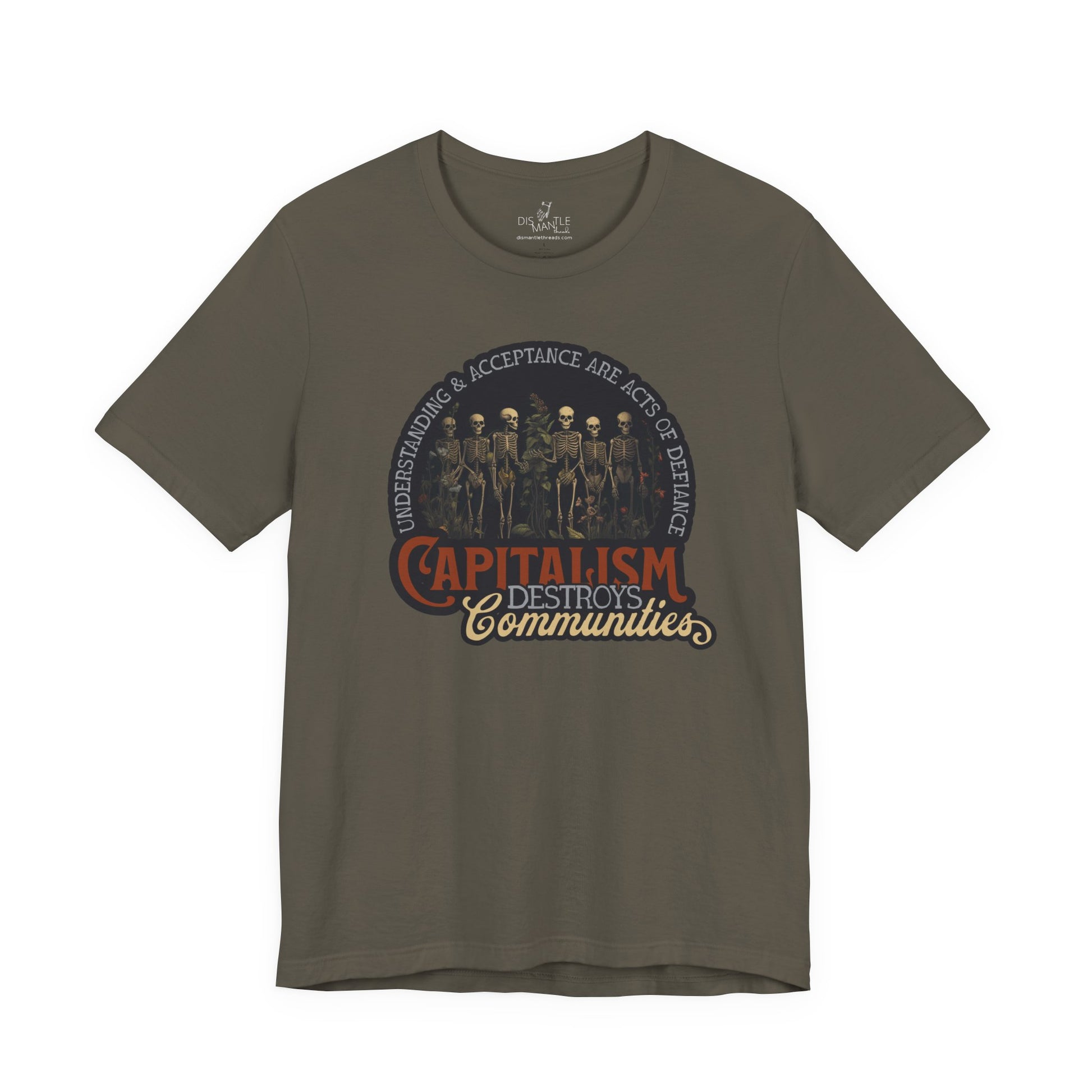 This unisex tee carries a stark illustration: skeletons below, a warning above — “Capitalism Destroys Communities” and “Understanding & Acceptance Are Acts of Defiance.”