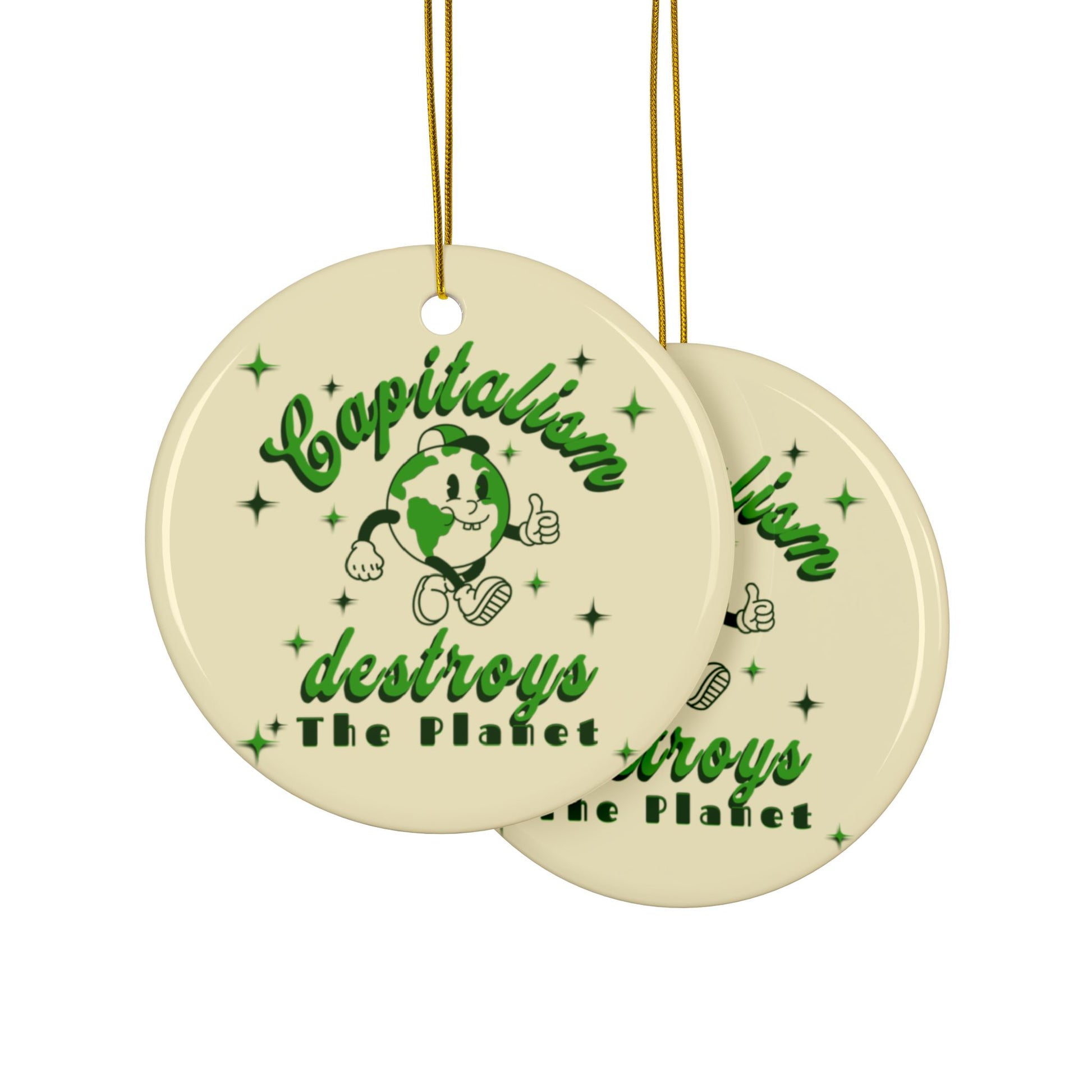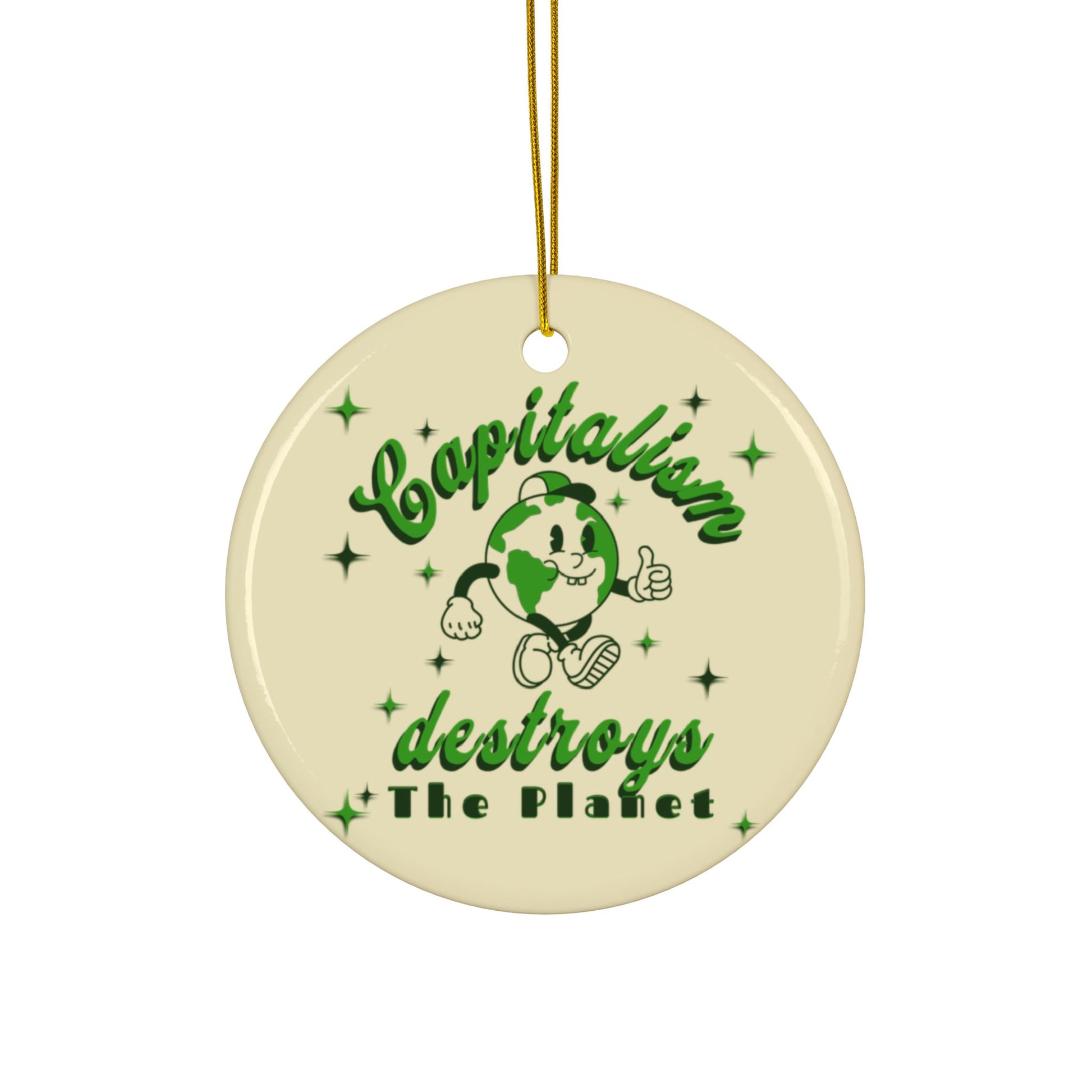 This retro-inspired ornament features a cheerful cartoon Earth mid-stride, bright green text wrapping around: “Capitalism Destroys the Planet.” Printed in bold green on a soft off-white background, it’s cute enough for a holiday tree… and pointed enough to spark a conversation.