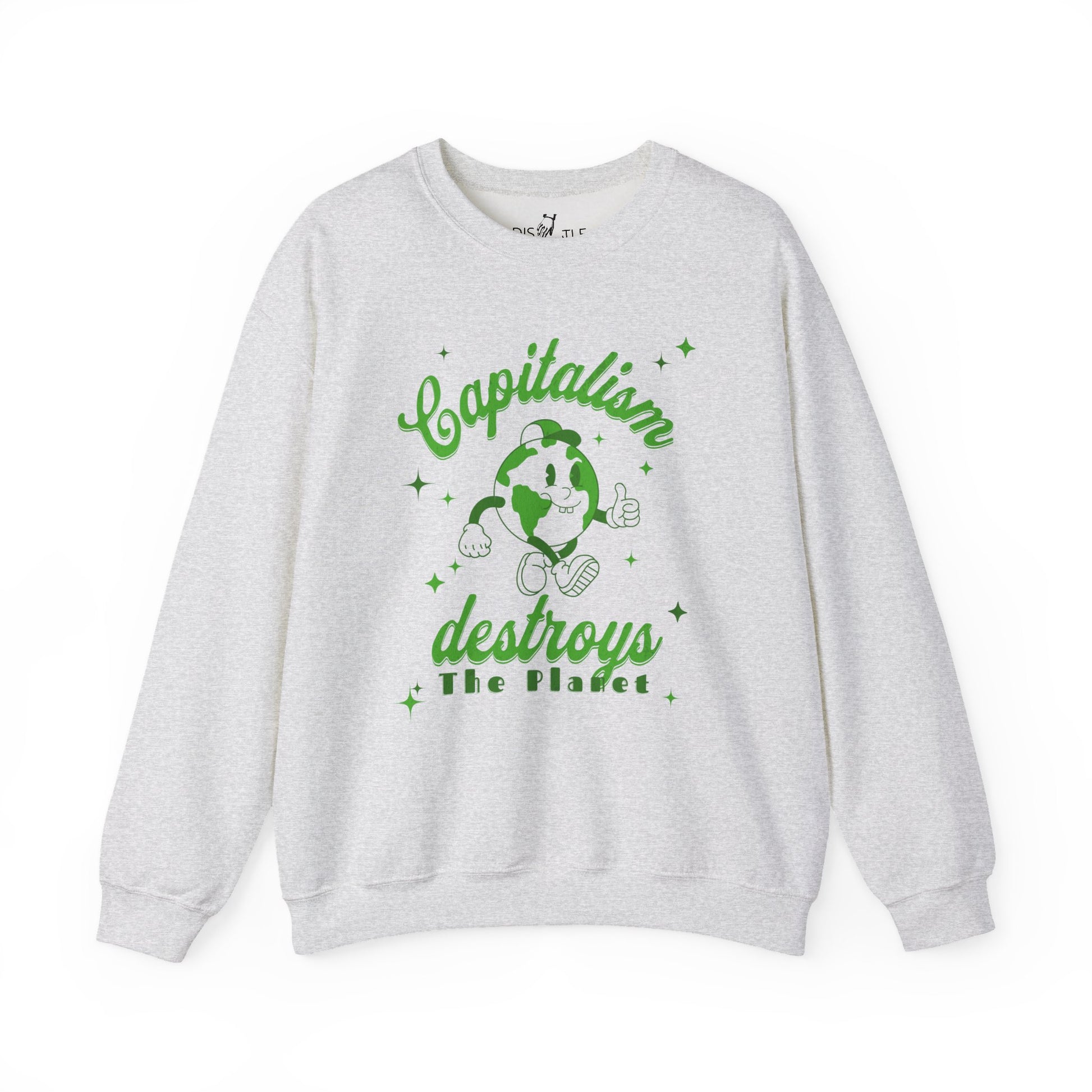 This sweatshirt features a cheerful, cartoon Earth-person strolling along with the words “Capitalism Destroys the Plant” in bold retro lettering. Printed in green on a soft off-white, gold, light yellow, or mint background, it looks upbeat at first glance — until you actually read it.