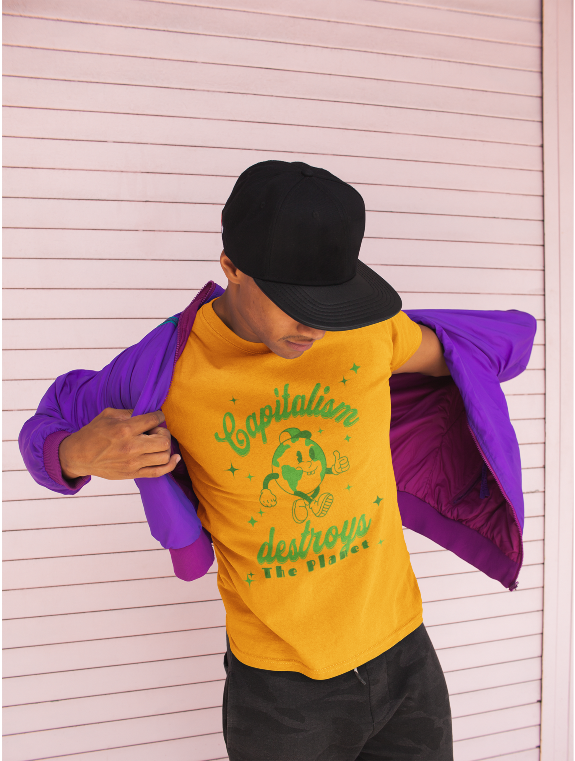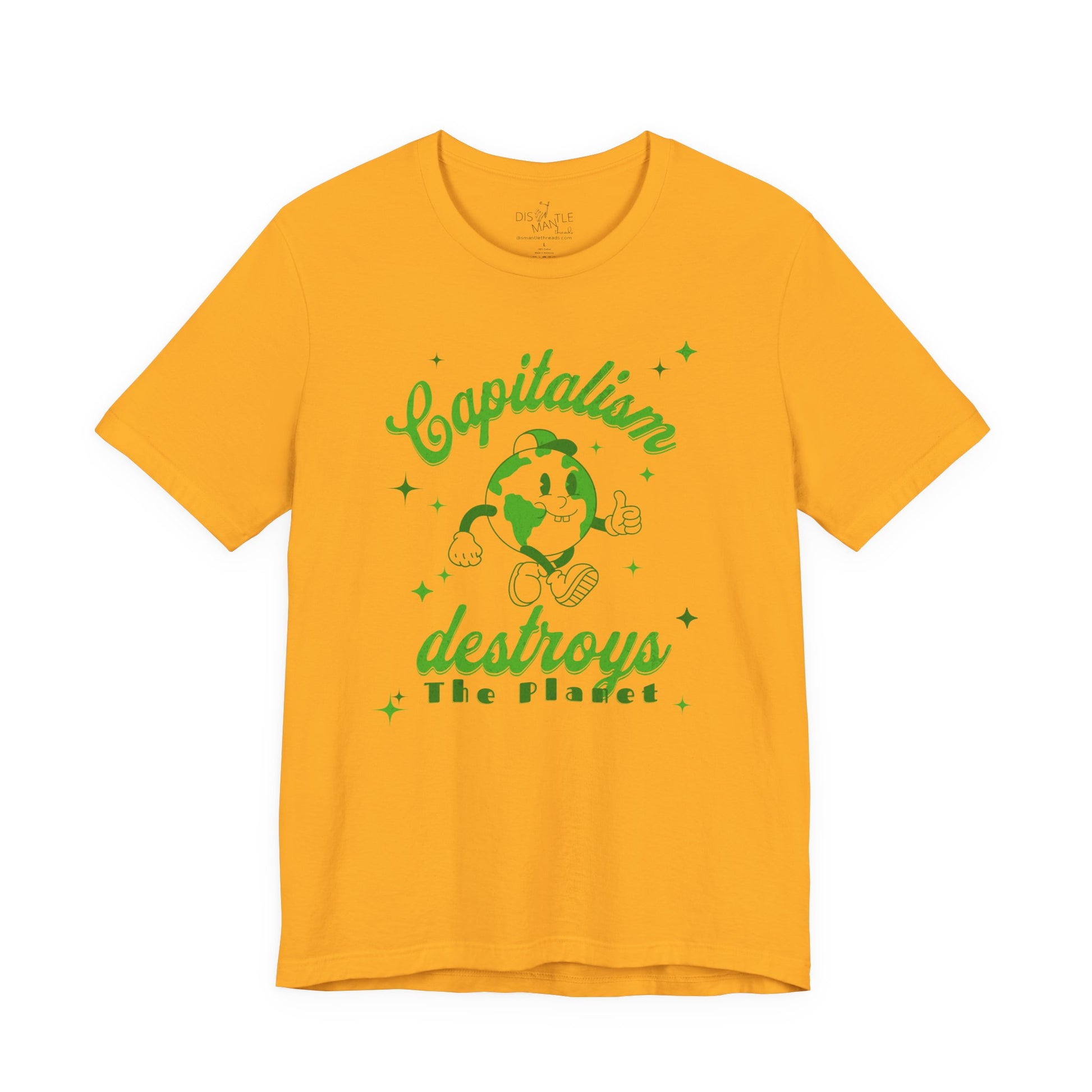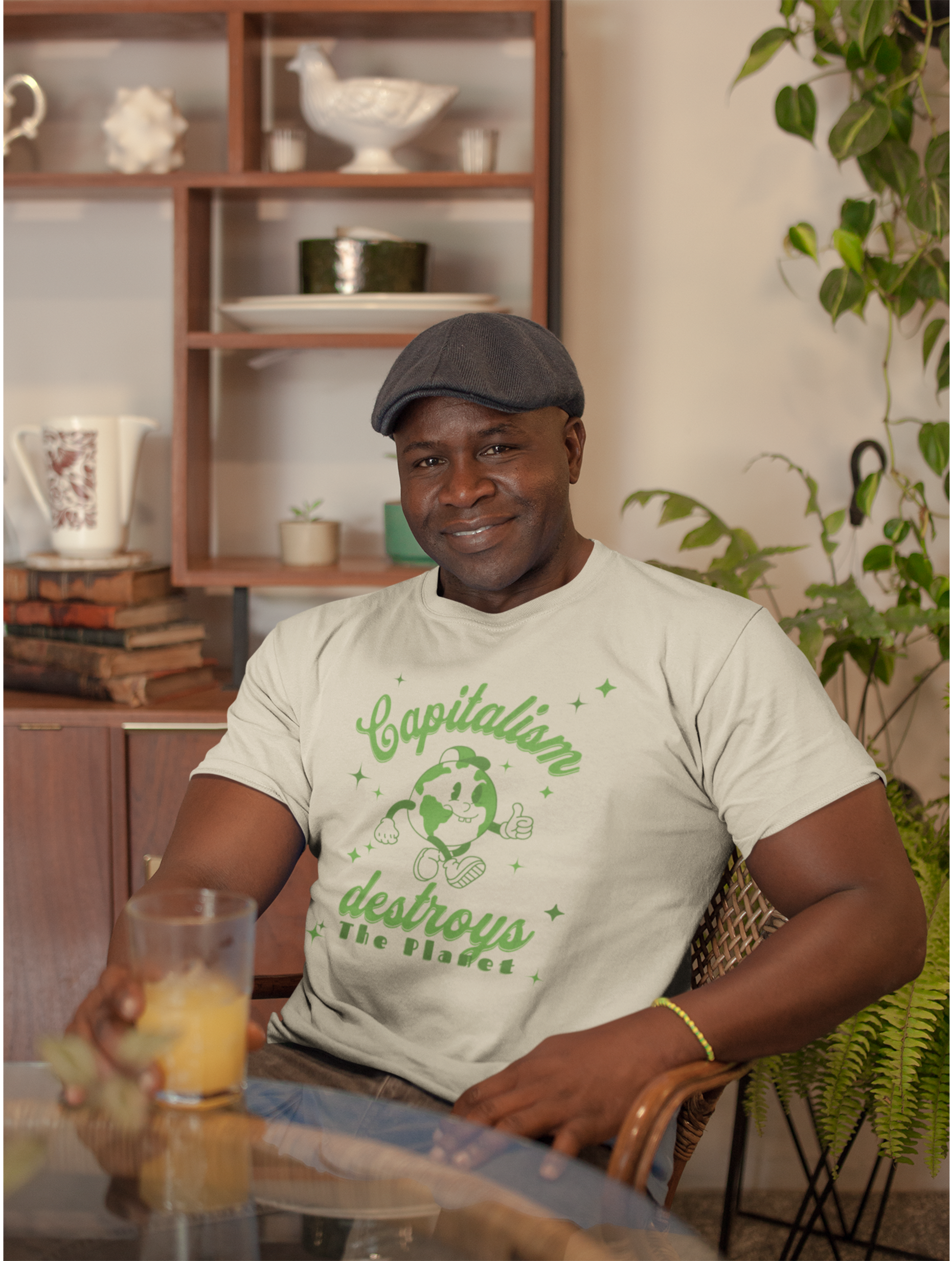 This tee features a happy cartoon Earth with legs, walking along like everything’s fine, under the caption: “Capitalism Destroys the Plant.”