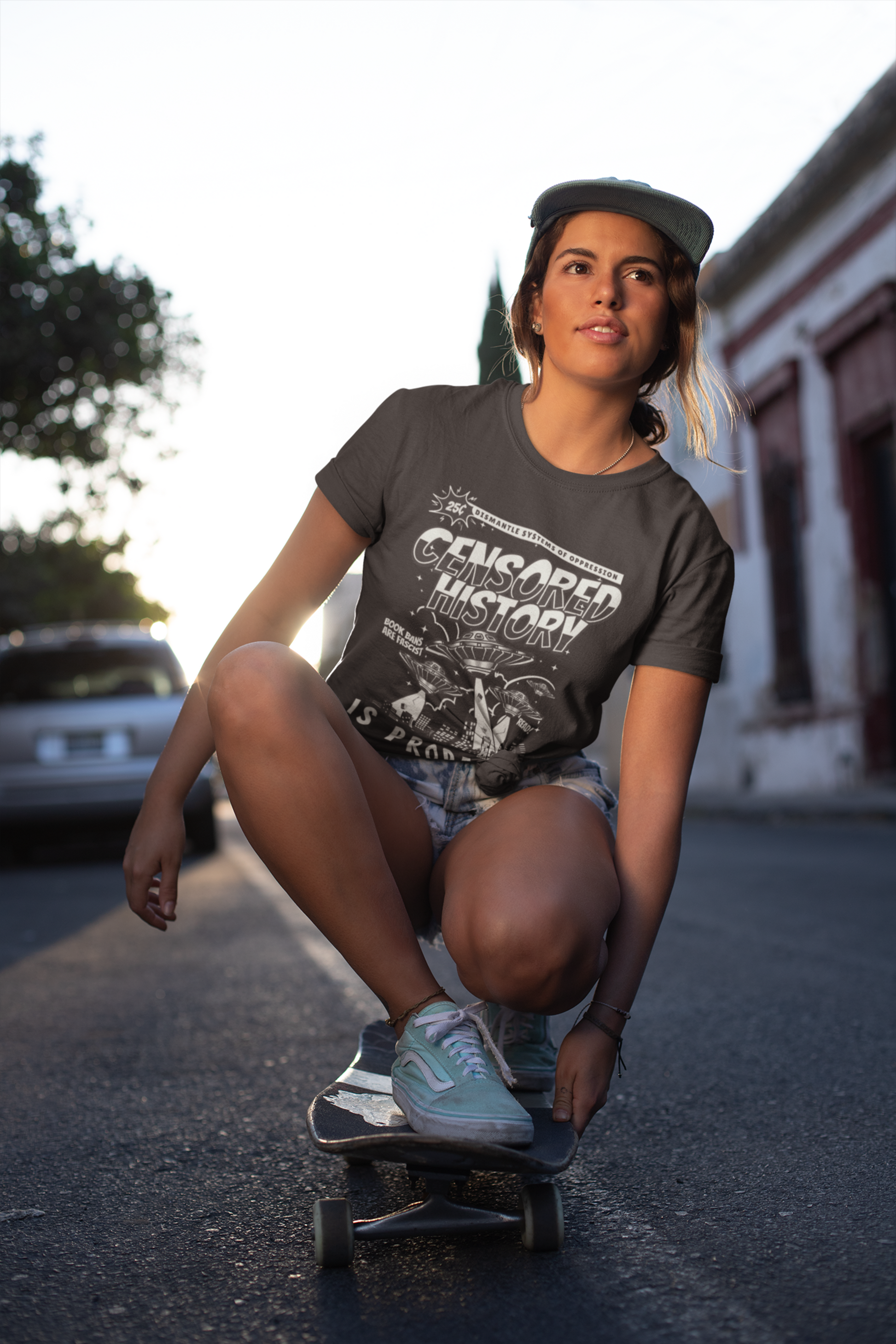 This design — a comic book–inspired image of a UFO abducting books — challenges the systems that fear knowledge. Across the artwork, the message is clear: