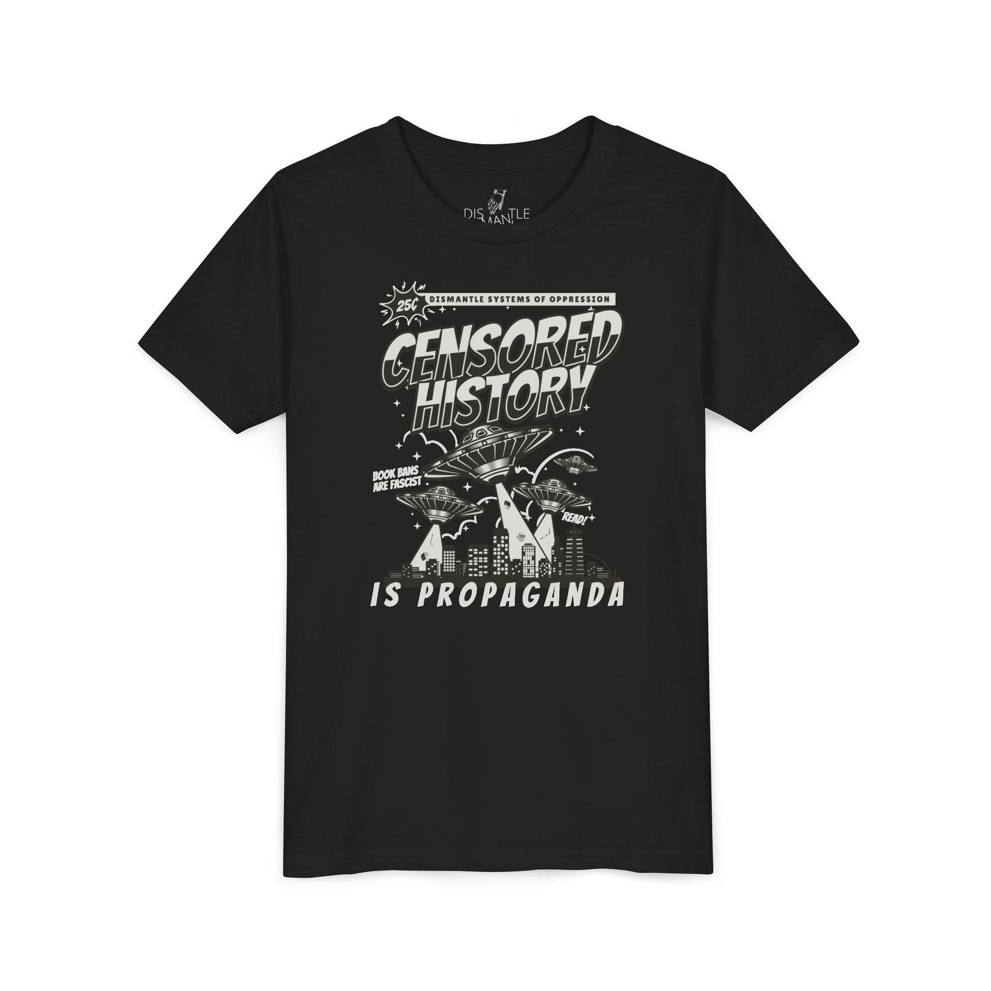 This youth tee features a vintage-comic style illustration: a UFO lifting books into its beam, framed with clear, unapologetic messaging — “Censored History Is Propaganda,” “Book Bans Are Fascist,” and “Dismantle Systems of Oppression.”