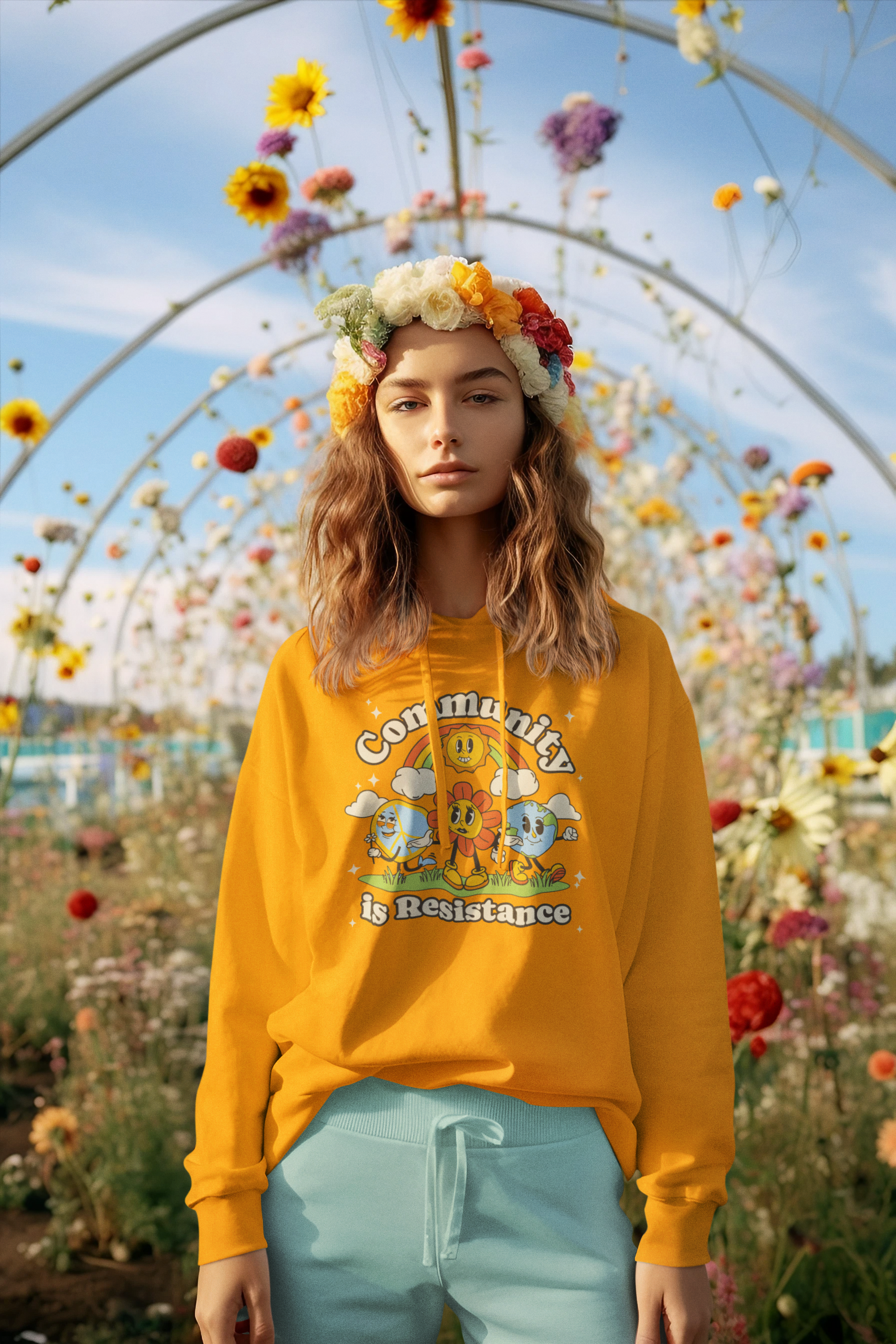 A soft hoodie featuring a cheerful Earth, peace sign, and flower in warm retro tones. Friendly visuals anchored by a straightforward message about solidarity.