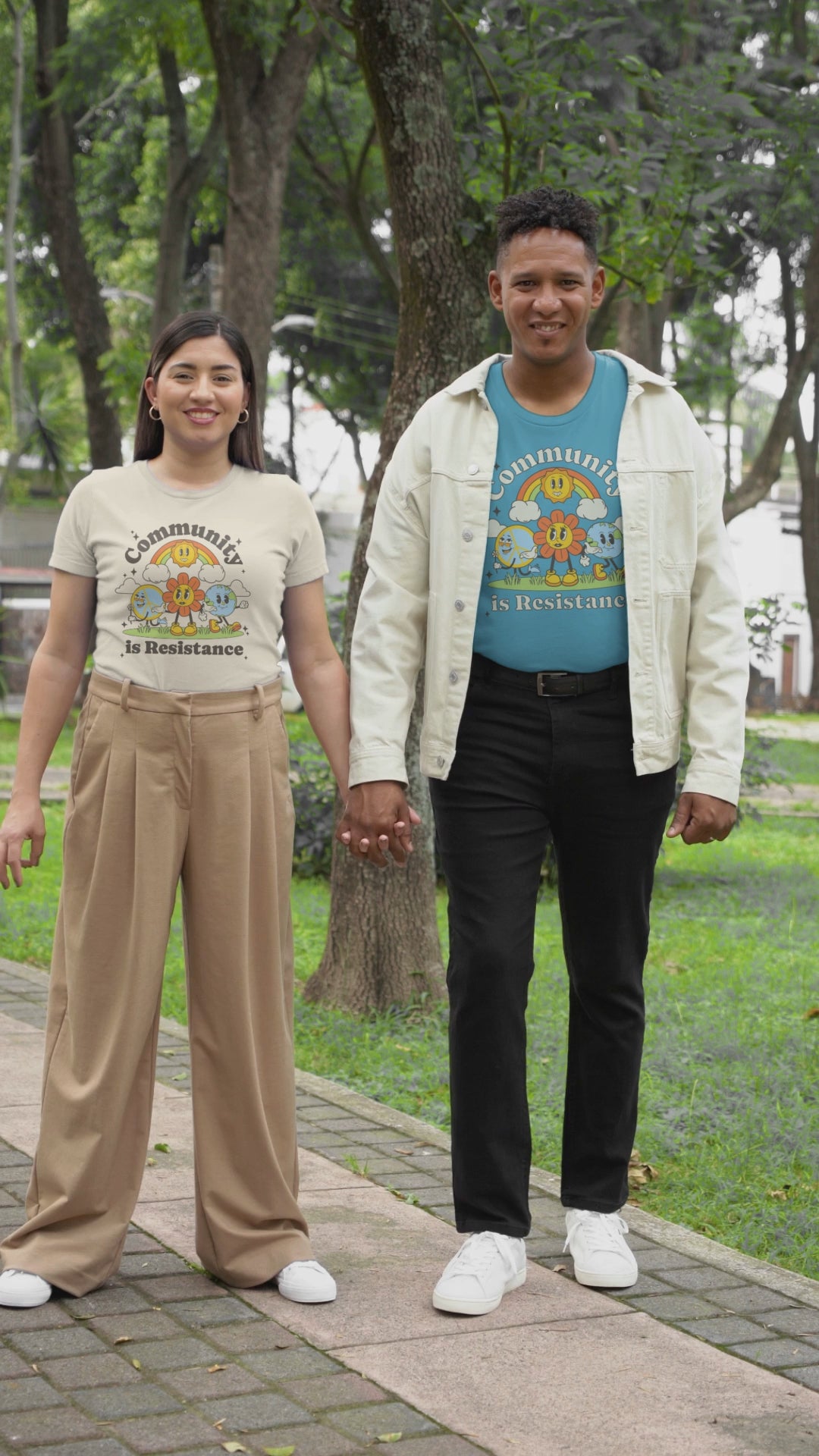 The illustration pulls from the bright, hopeful art styles of the late 60s and early 70s. Rounded shapes, friendly characters, and a palette of oranges, mustard, teal, brown, and soft cream give it that familiar peace-era glow. The message sits underneath the playfulness: community is the strongest defense people have when government systems turn hostile or indifferent. In a moment that feels like a long, slow-burning dumpster fire, the design points back to what actually works. We turn toward one another. We organize, share resources, and show up. Community isn’t a soft concept — it’s a survival strategy.