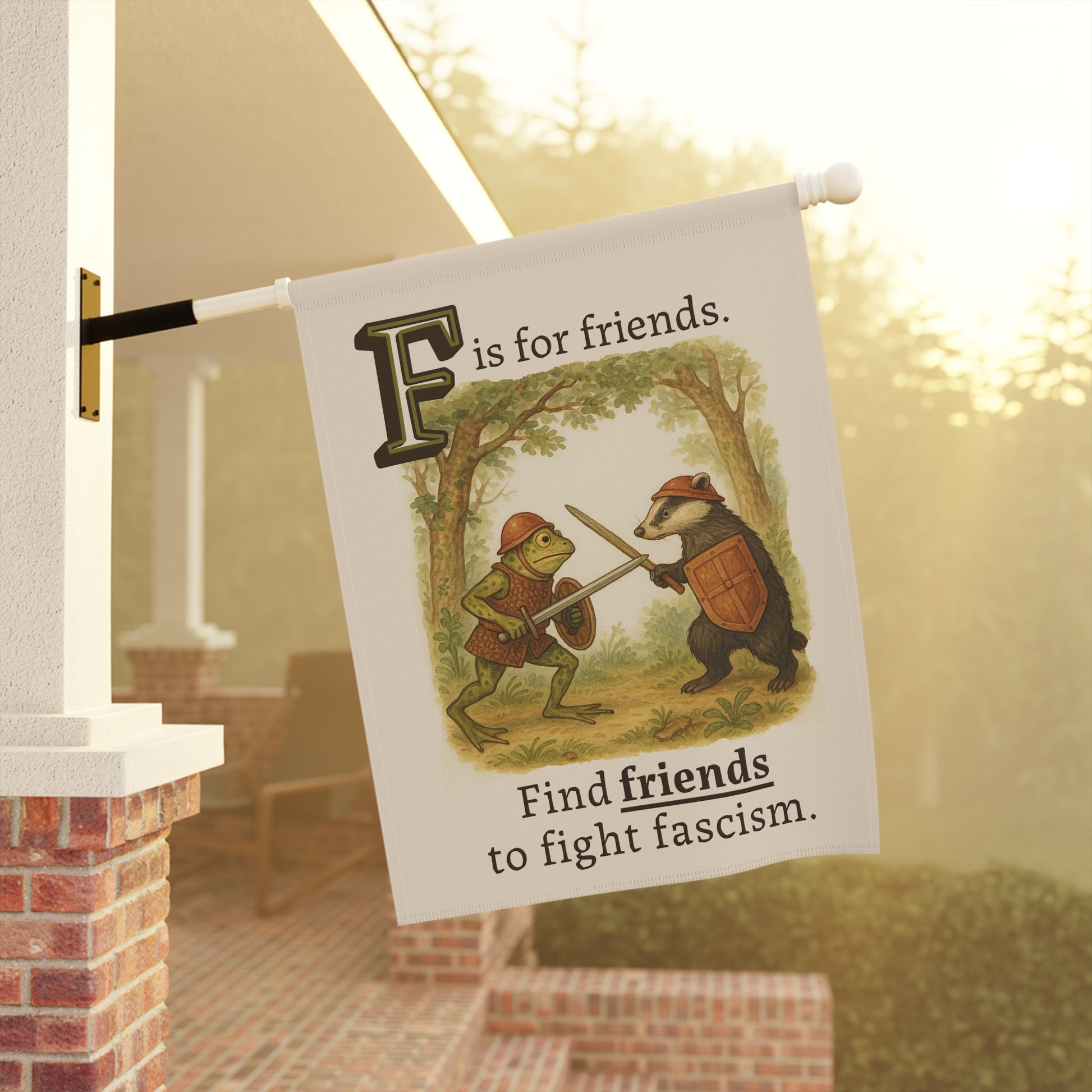This garden flag features the woodland illustration from the Resistance ABCs Collection — a frog and a badger standing side by side in a forest clearing.