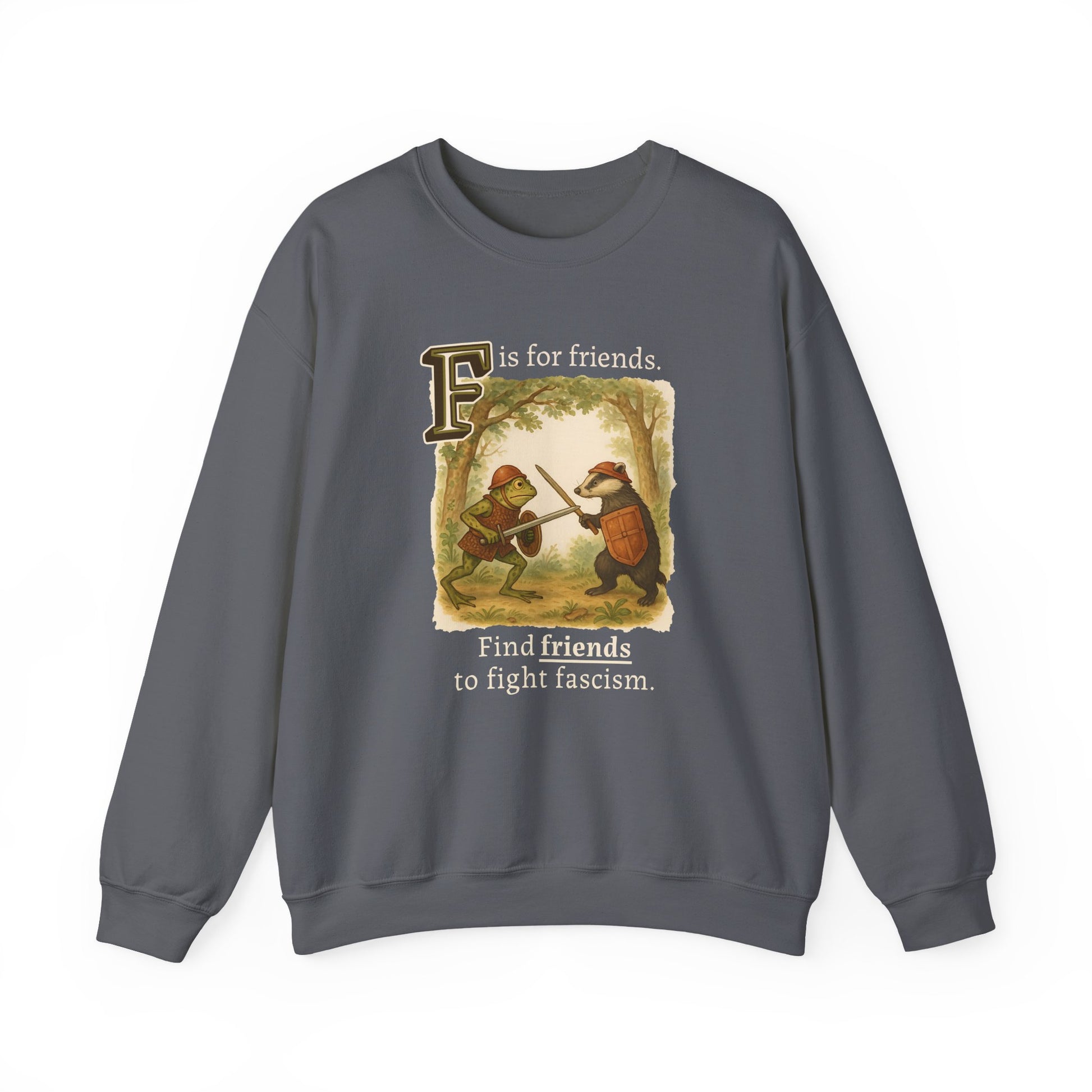 This sweatshirt features a frog and a badger standing together in a quiet woodland scene — soft illustration, firm intention.