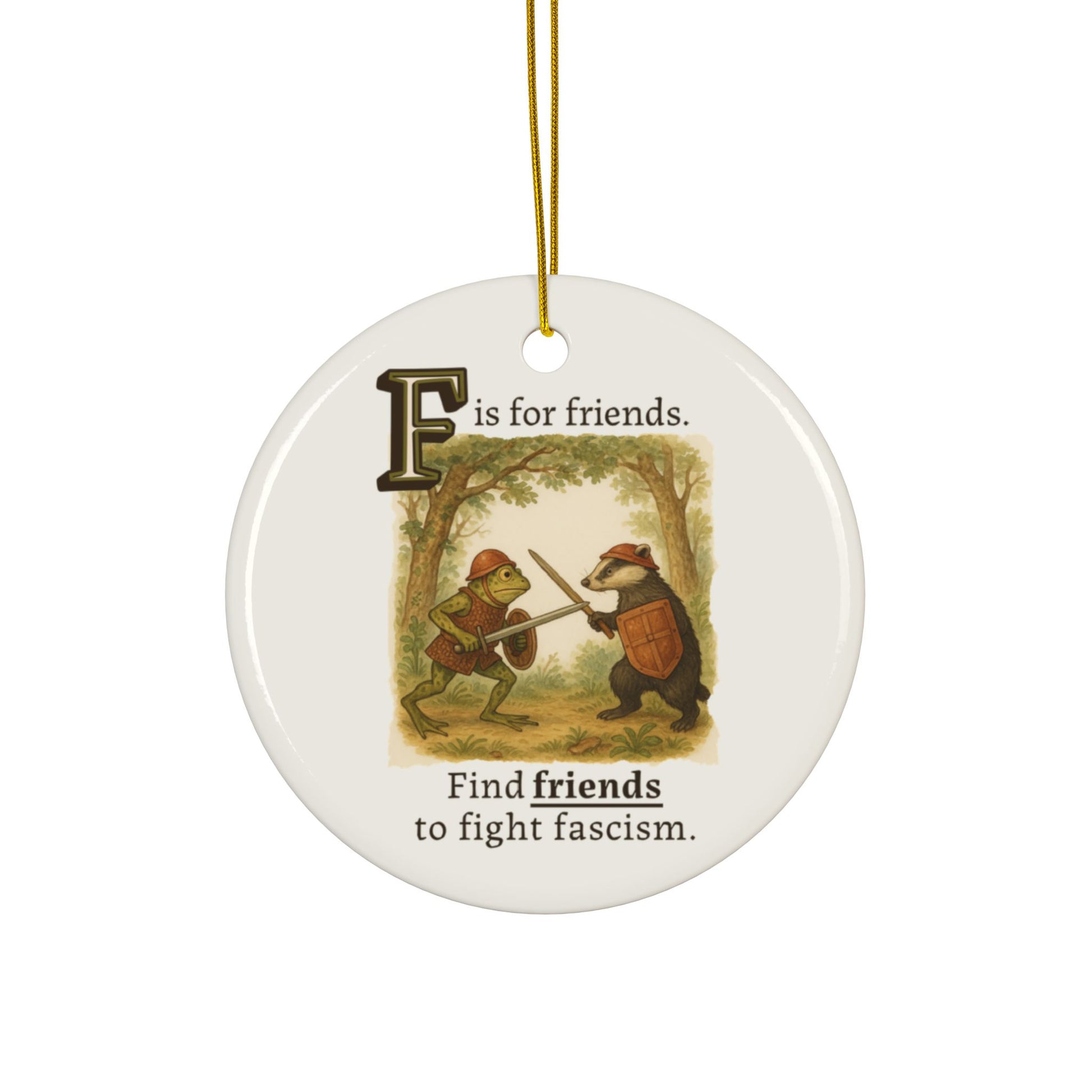 This ornament features the woodland duo from the Resistance ABCs Collection — a frog and a badger standing together beneath forest trees, drawn in a vintage storybook style.