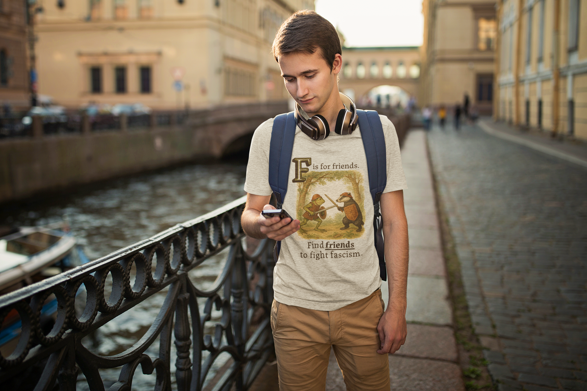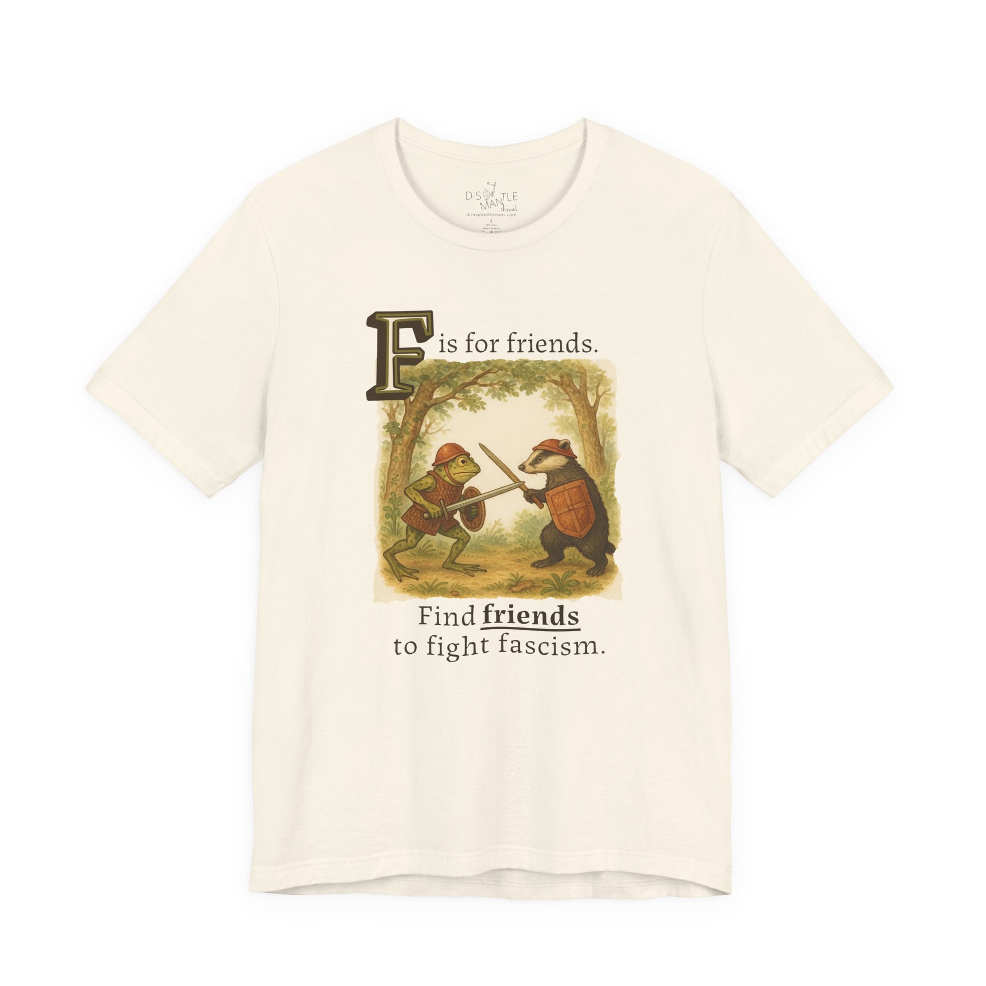 This design looks like a page from a vintage children’s book, but the message is unmistakably modern. A frog and a badger stand together in a quiet woodland scene — soft in illustration, firm in intention.