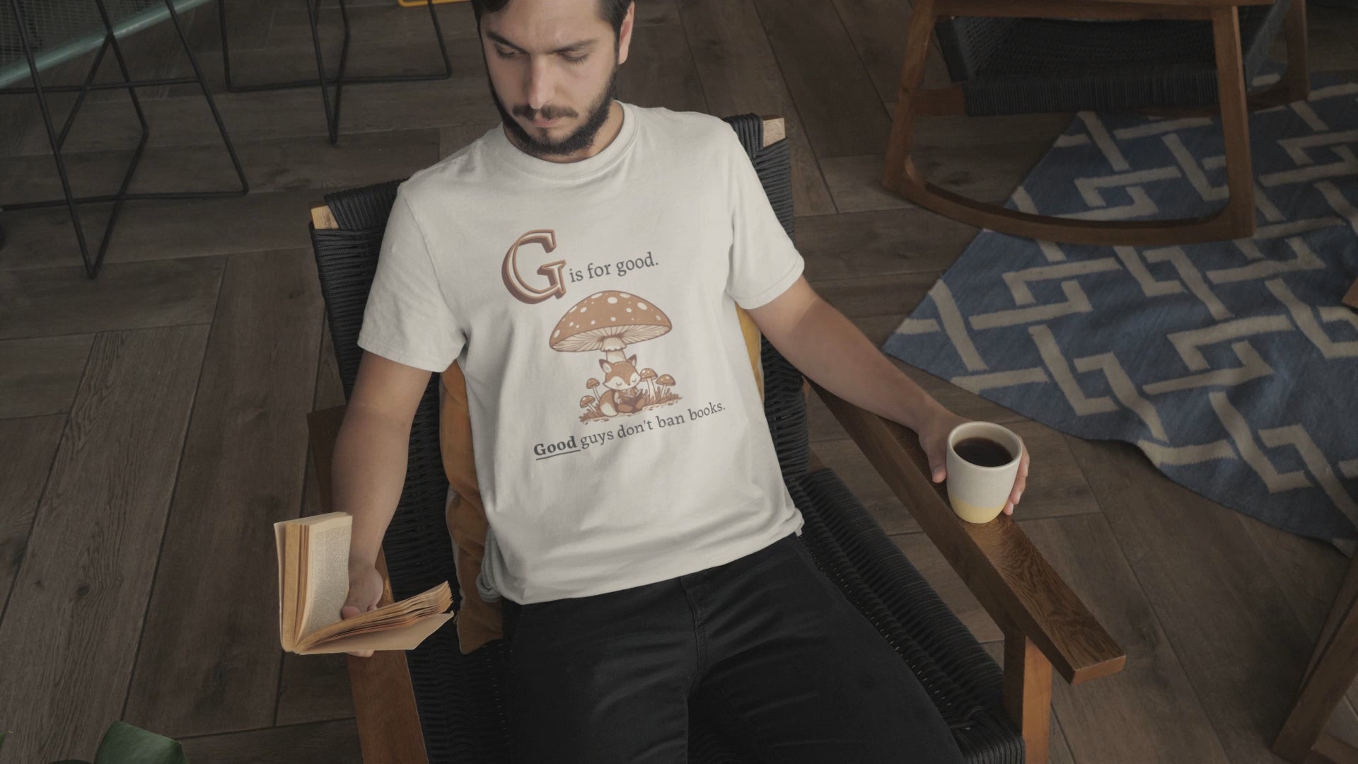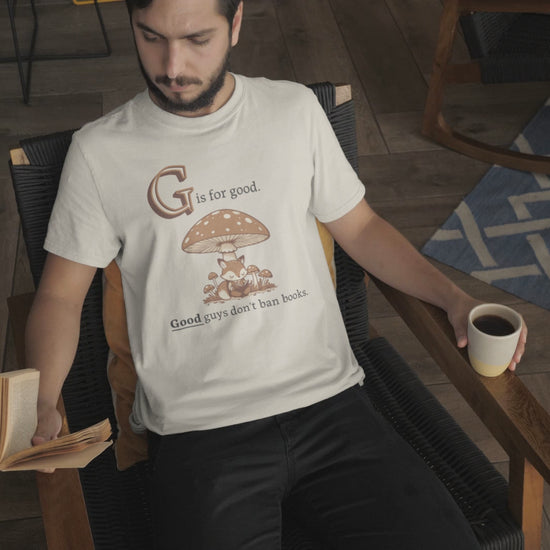 This tee looks like a page from a cozy children’s book: a fox reading under a toadstool, soft colors, storybook charm. Then you catch the caption: