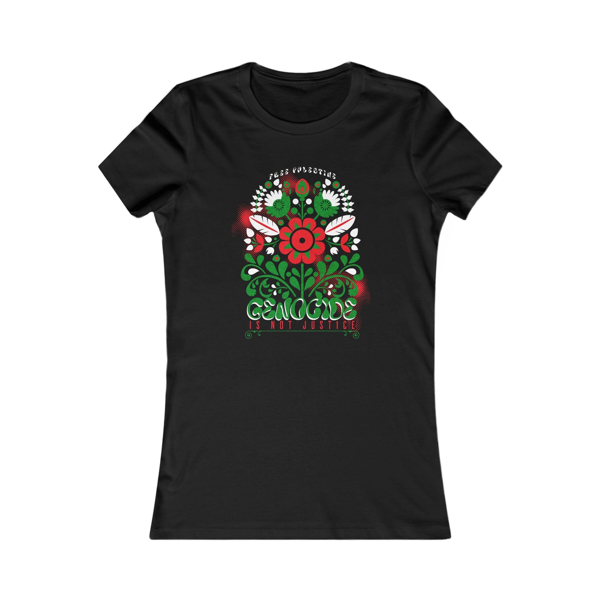 This women’s fitted tee features the phrase “Genocide Is Not Justice” alongside “Free Palestine,” framed by a floral design rooted in traditional Palestinian colors. It’s form-fitting, soft, and built for people who understand that visibility is part of the work. The cut is comfortable and structured, with a message that does not waver.