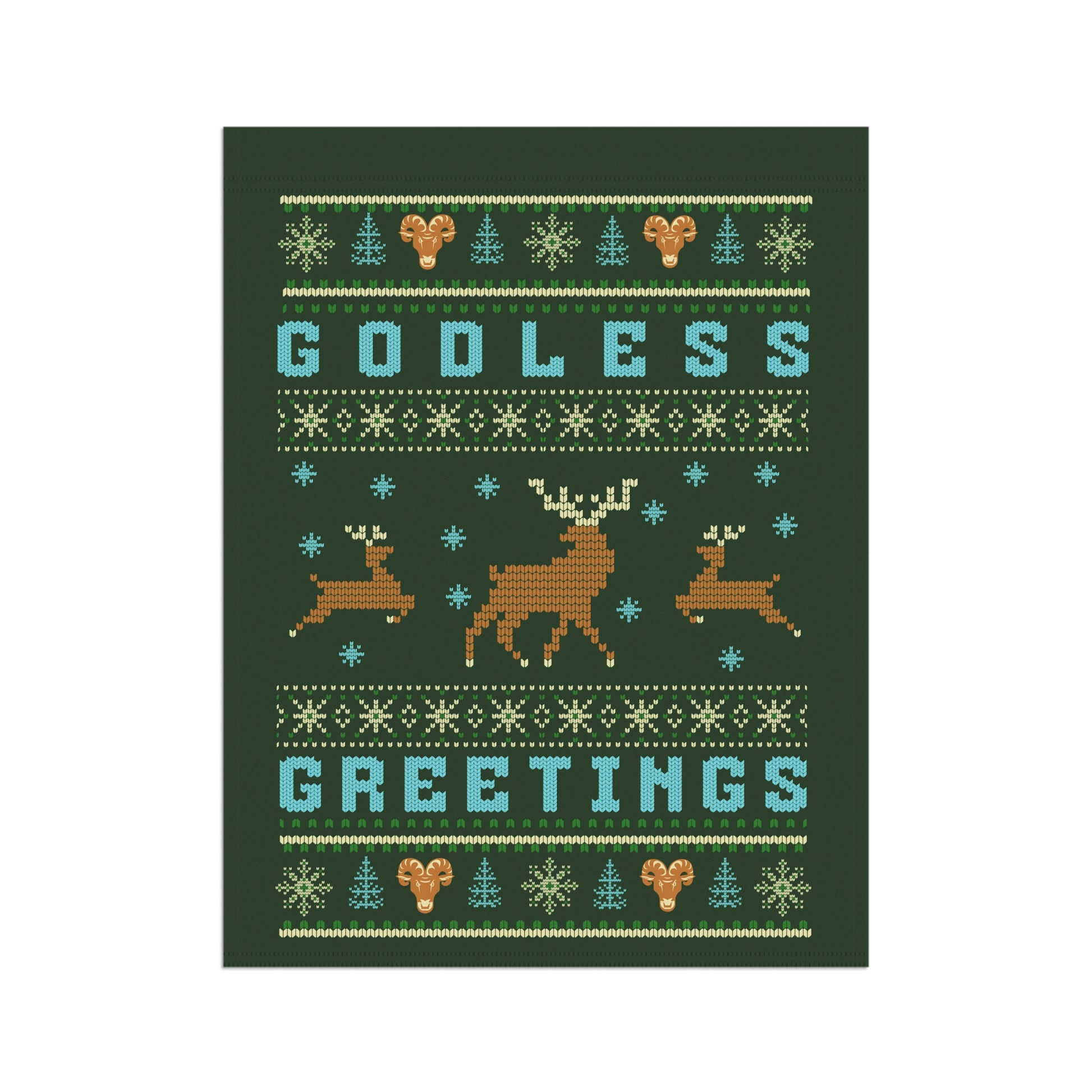 This bold house flag takes the classic ugly Christmas sweater layout and swaps the sermon for something far more honest: Godless Greetings in big, unapologetic type, wrapped in winter icons and geometric patterning.