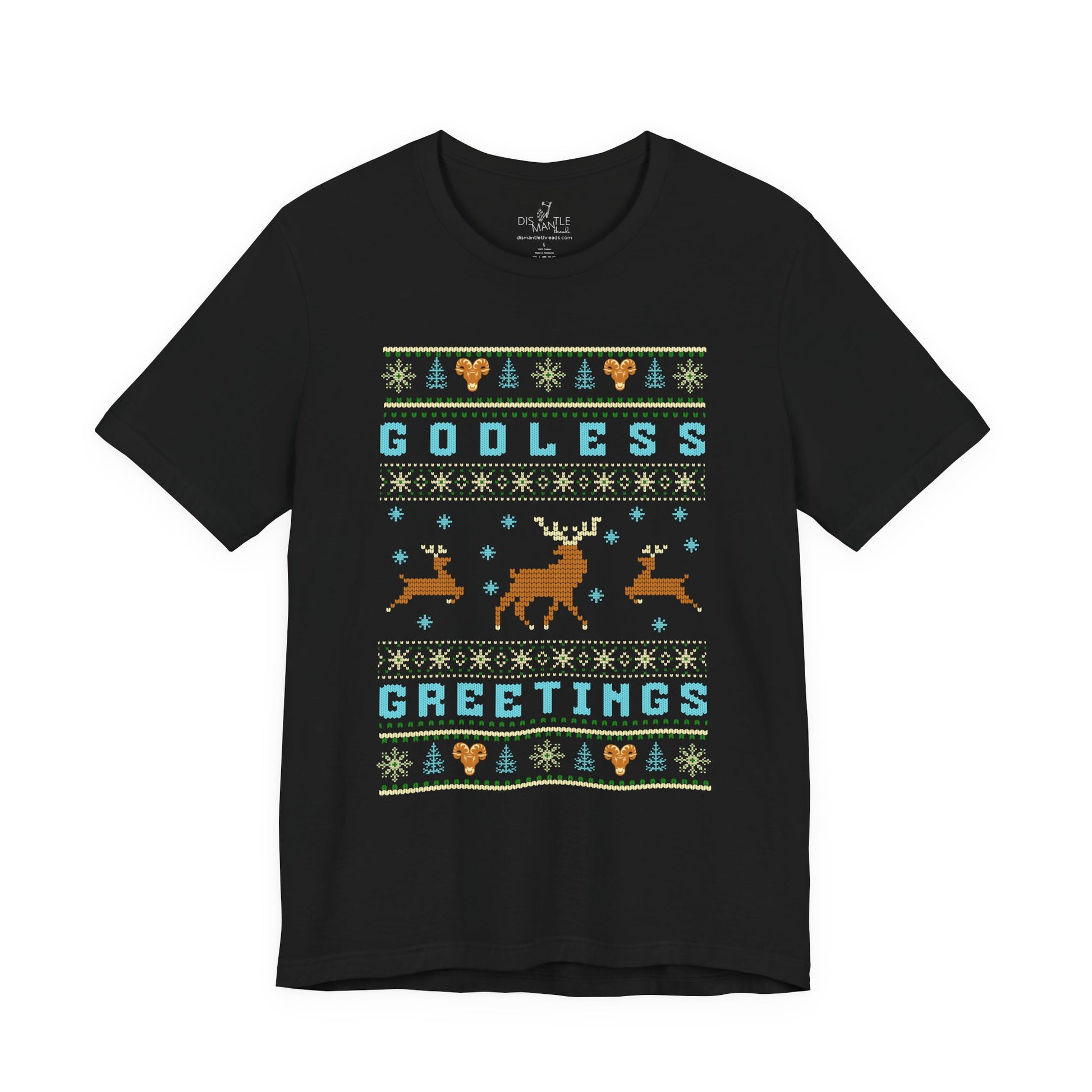 This tee features a bold “Godless Greetings” design in classic knit-style graphics — snowflakes, borders, and holiday patterning that read festive from a distance and quietly heretical up close. It’s cozy on the surface and unapologetically secular underneath.