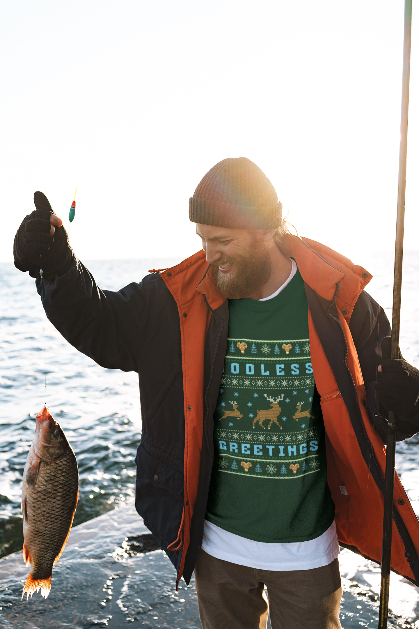 This design borrows the visual language of traditional Christmas sweaters — repeating motifs, knit-style texture, and familiar holiday rhythm — then swaps out the pious messaging for something a lot more honest. “Godless Greetings” is a wink to everyone who enjoys the lights, food, and community but doesn’t feel represented by the religious script that usually comes with it.