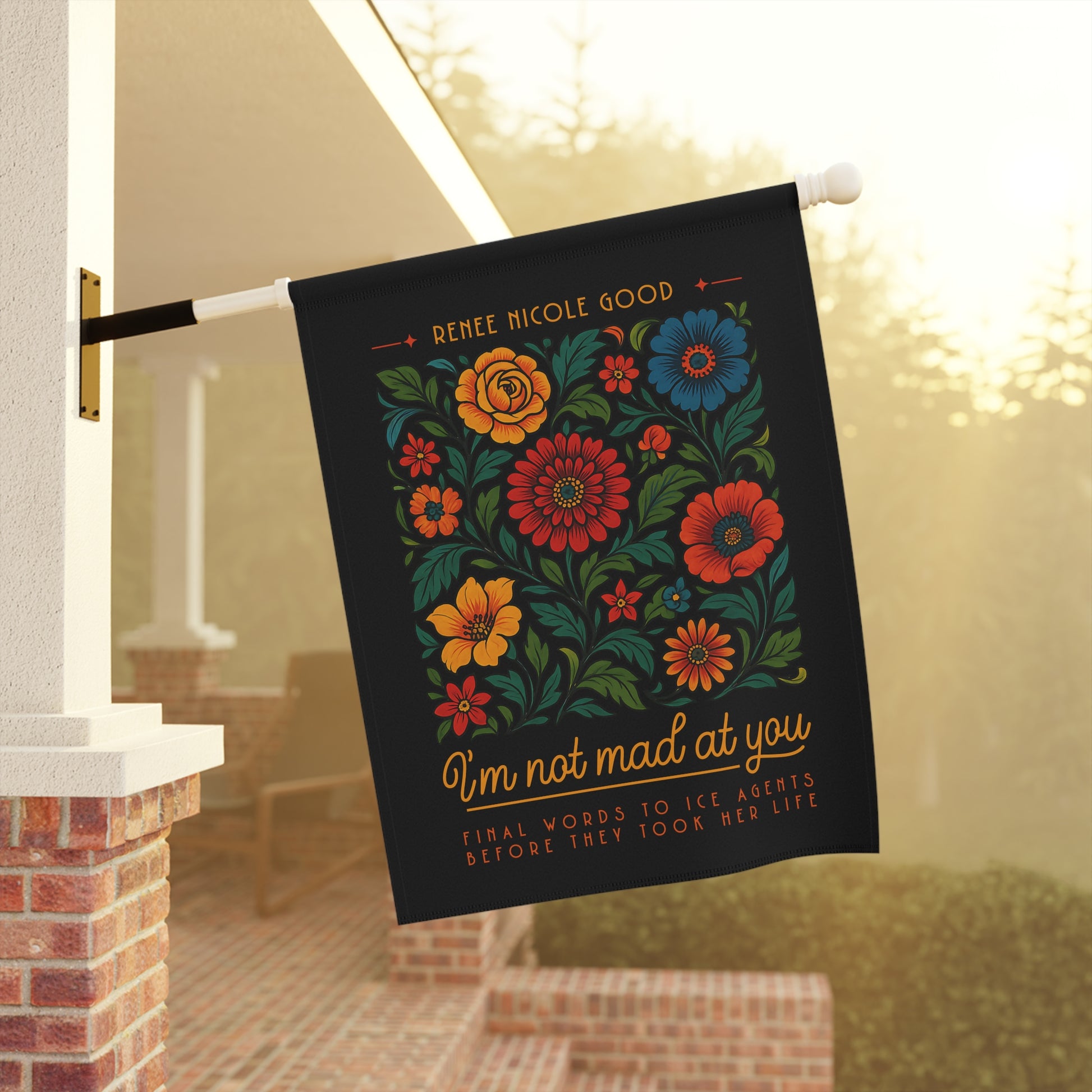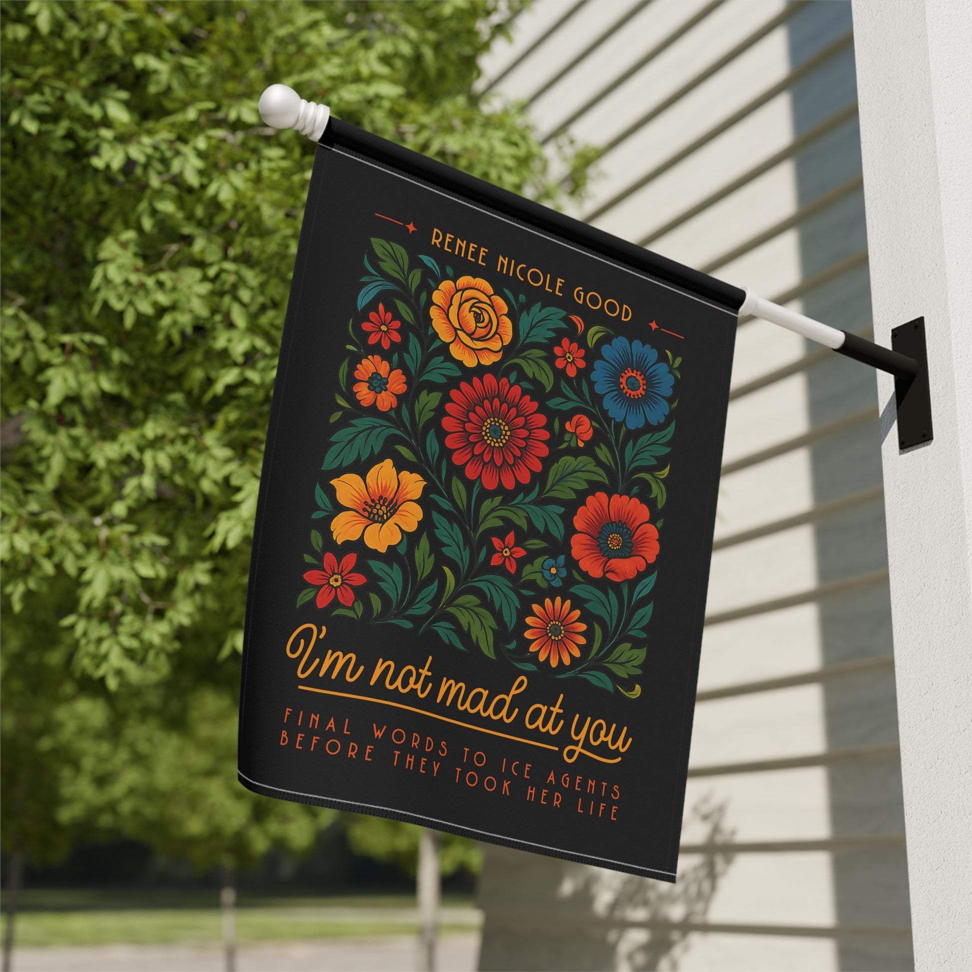 A memorial flag printed on a deep black background, with bold floral artwork framing Renee’s final recorded words. The black backdrop makes the color and the message stand out — not as aggression, but as remembrance. This piece is for porches, balconies, gardens, and windows — anywhere you want beauty, dignity, and memory to be visible.