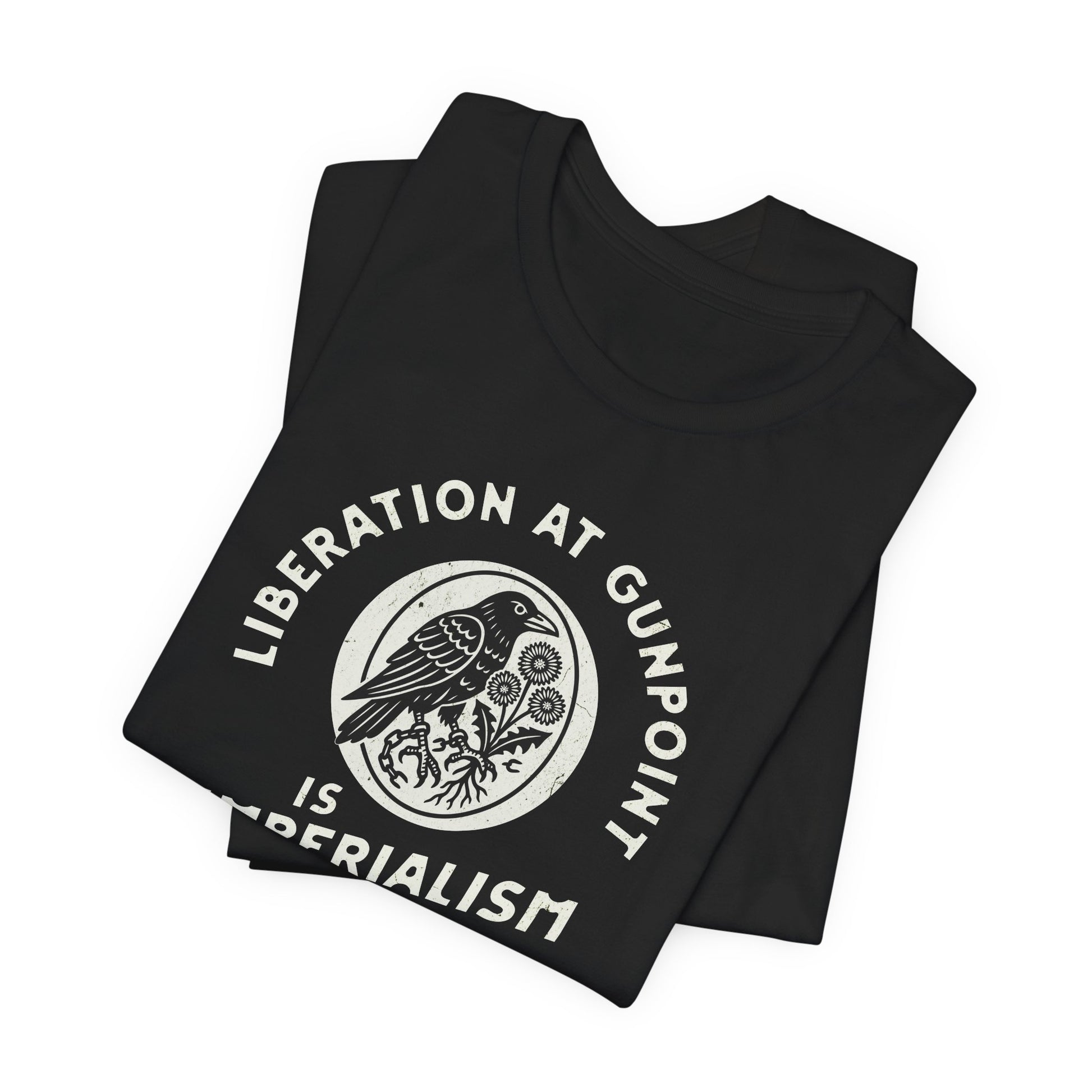 This tee challenges U.S. intervention and foreign policy in plain language: liberation at gunpoint is not liberation — it’s imperialism.