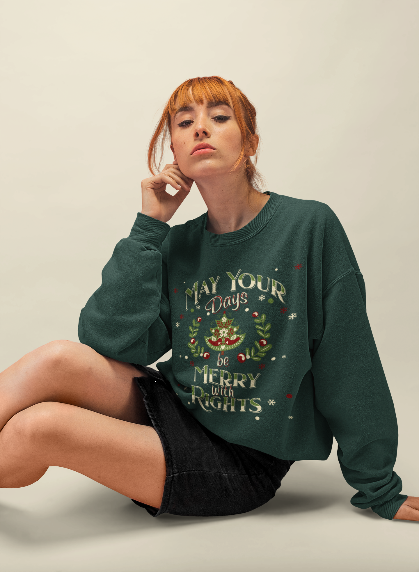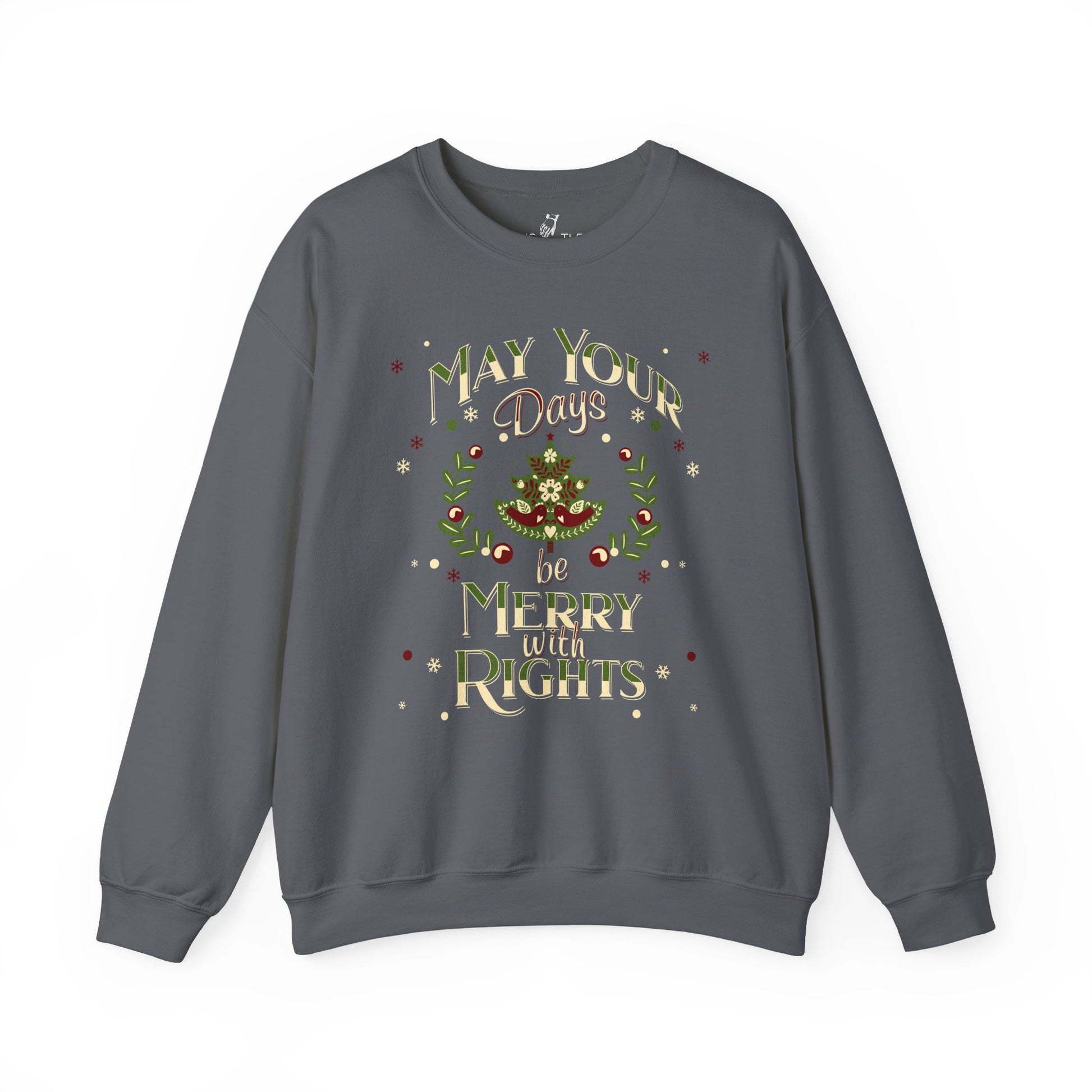 This cozy unisex sweatshirt features the phrase “May Your Days Be Merry With Rights” in vintage-inspired holiday script, surrounded by subtle seasonal flourishes. It takes the softness of classic Christmas typography and pairs it with a truth the season can’t gloss over: joy means nothing without equality.