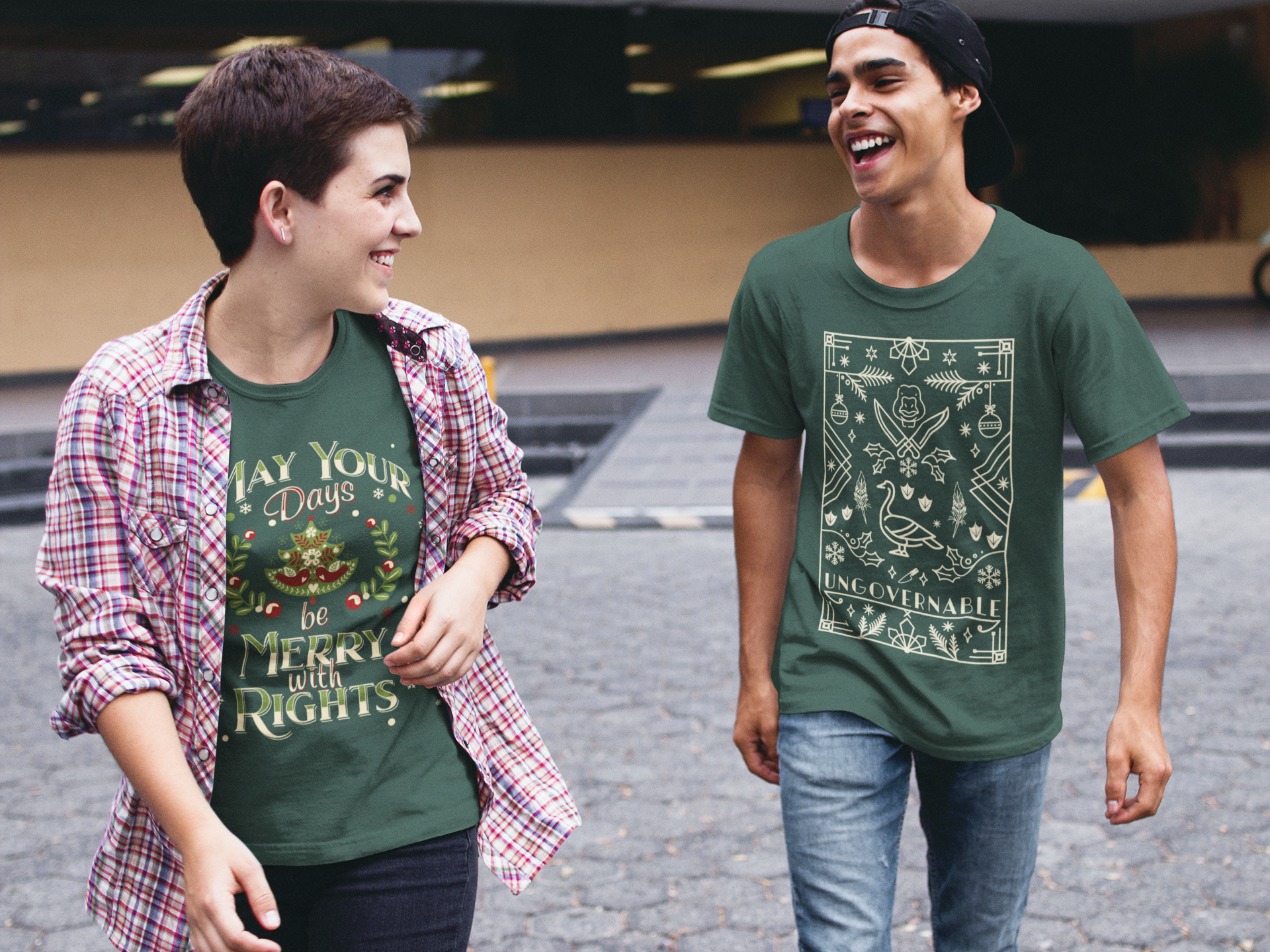 This unisex tee features the phrase “May Your Days Be Merry With Rights” in vintage-inspired holiday script — warm, charming, and just sharp enough to land the point under the twinkle lights. It takes the coziness of a classic seasonal greeting and adds the one thing it’s always been missing: equality.