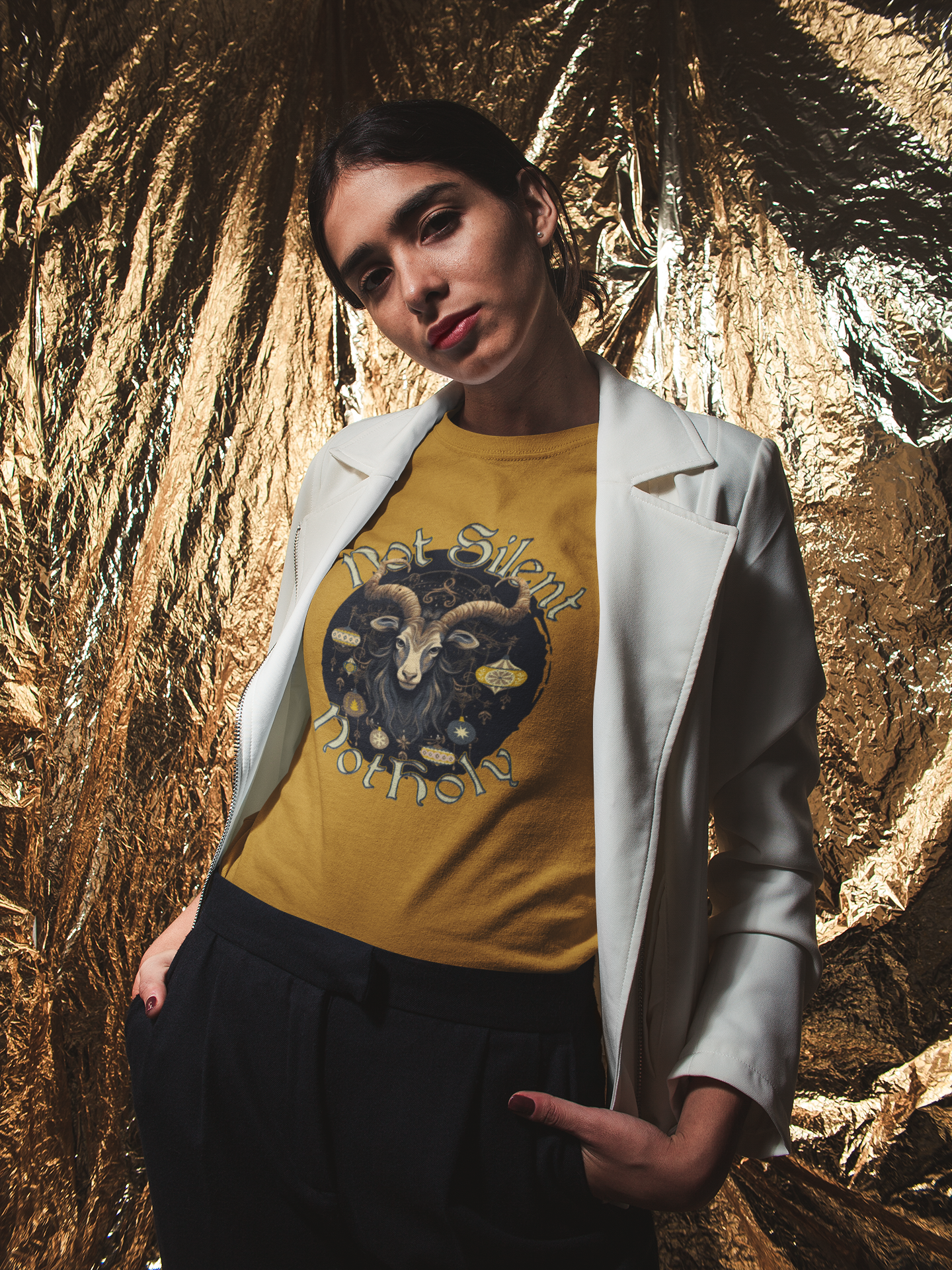 The design honors pre-Christian winter rites — rough, sacred, loud, feral. The Yule Goat stands untamed, crowned and tangled, a figure pulled from older, wilder winters. Paired with “Not Silent, Not Holy,” it resists modern expectations of quiet femininity and holiday obedience. The palette leans into earth-hearth tones rather than plastic holiday colorways, grounding the artwork in folklore, ancestry, and winter’s raw edge.