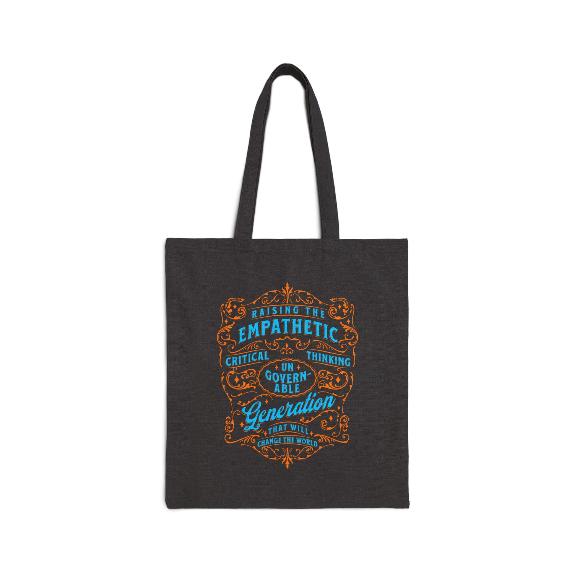 This tote features “Raising the Empathetic, Critical Thinking, Ungovernable Generation” — a clear statement from Gen X and millennial parents raising kids who question, notice, and refuse quiet compliance. Soft in tone but unmistakably political, it’s a carry-all for people raising tomorrow’s revolutionaries.