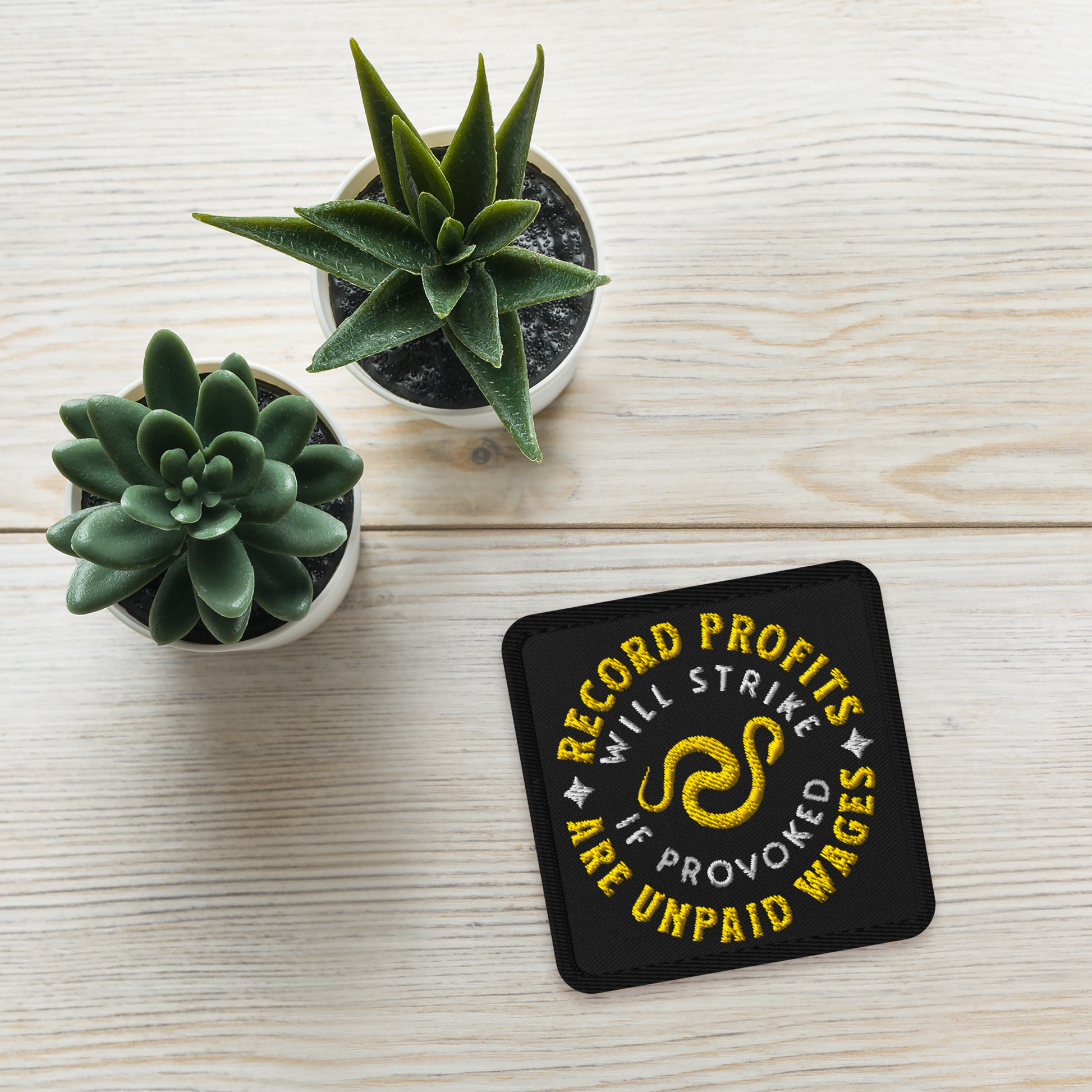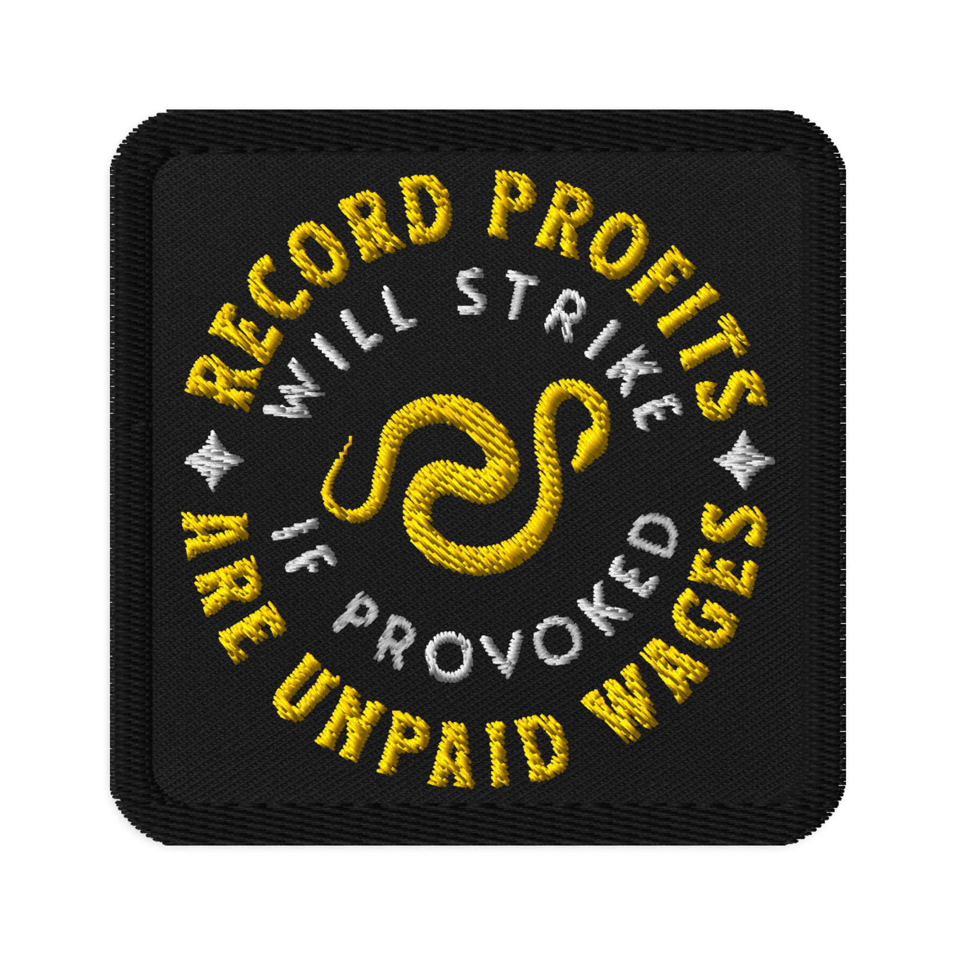The square format gives this design the feel of a modern union label — bold text, solid framing, and a coiled snake symbolizing readiness and resistance. It’s part of the Record Profits Collection, created for those who know every “record quarter” is built on unpaid labor and unacknowledged effort.