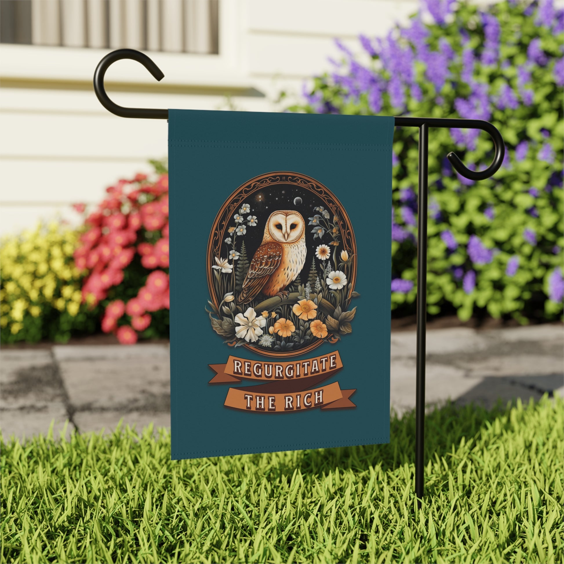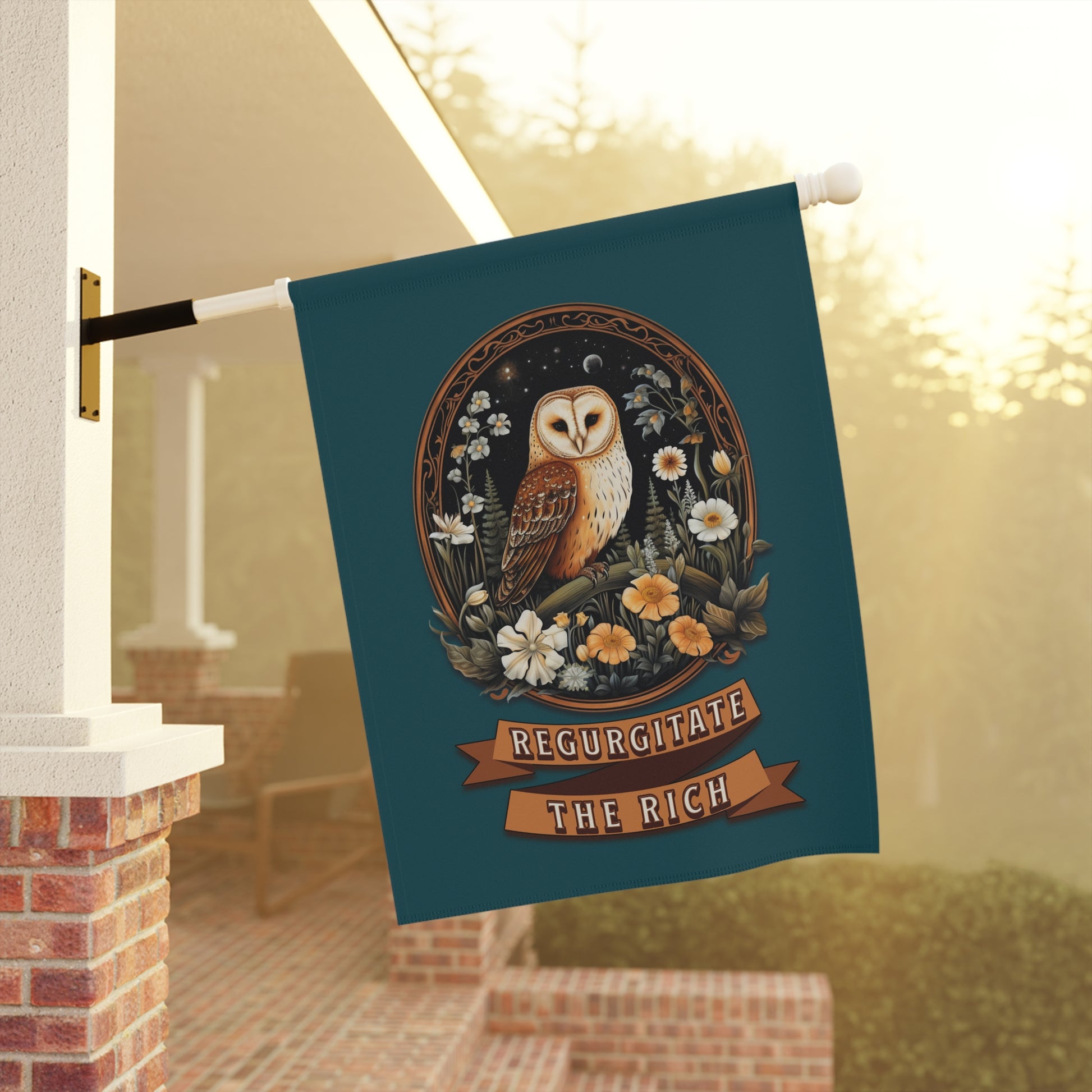 This garden flag features “Regurgitate The Rich” framed by a majestic owl and a delicate floral crest — a folklore-inspired, cottagecore twist on the classic Eat the Rich sentiment. Soft in appearance but unmistakable in message, it turns any yard, balcony, or indoor wall into a quiet declaration of anti-capitalist clarity.