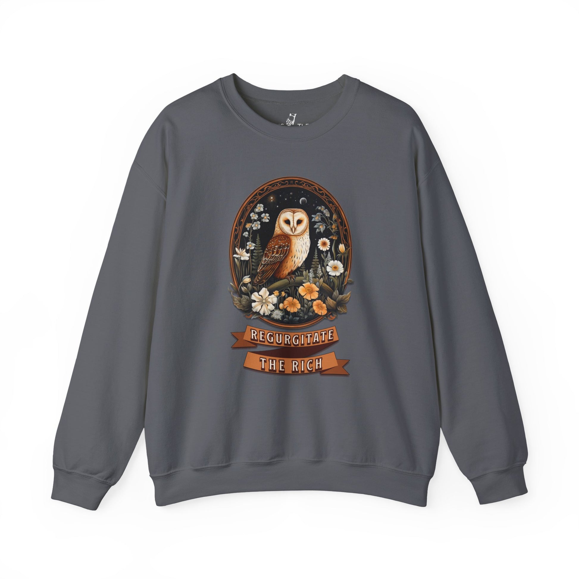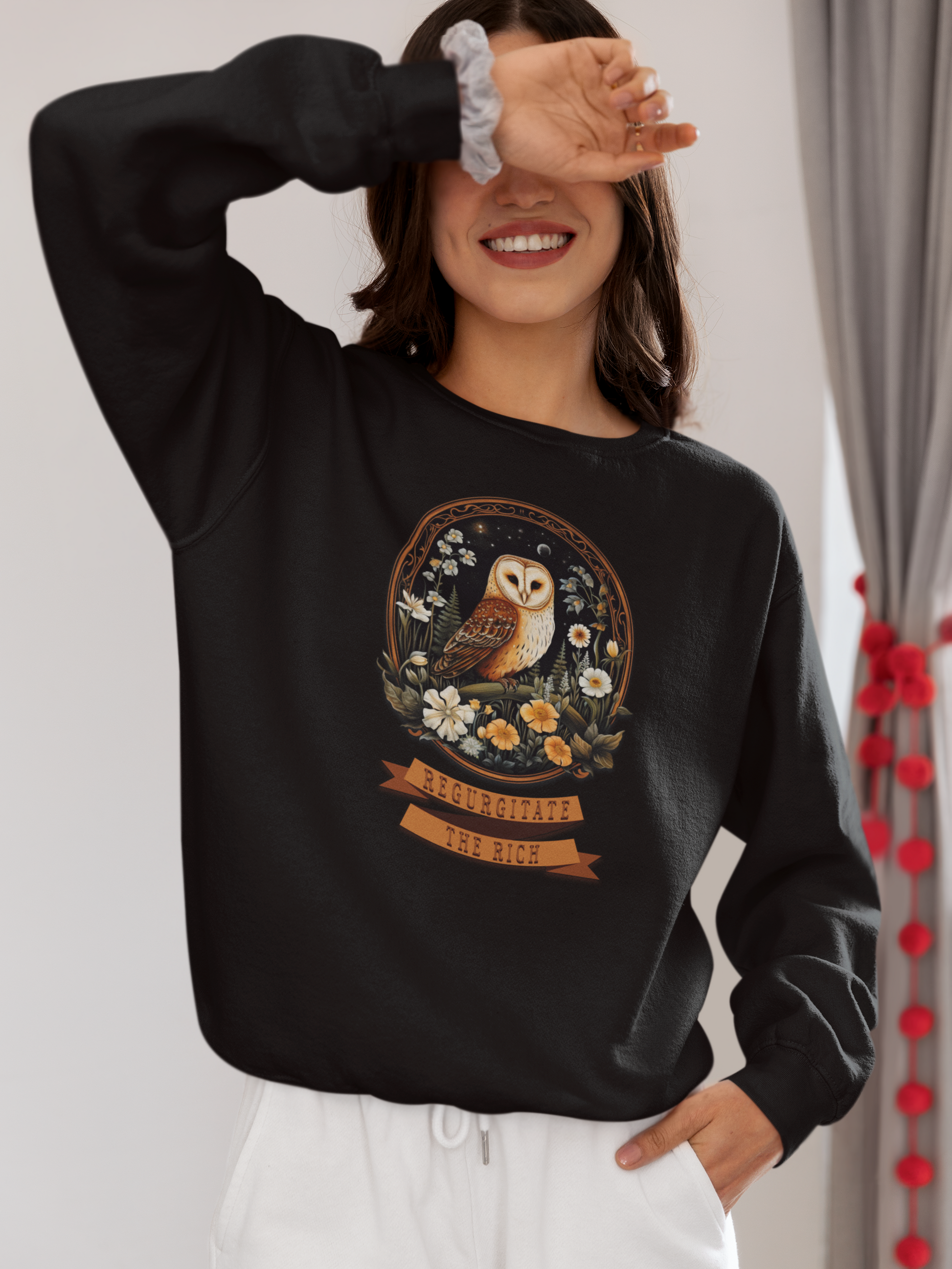 This unisex sweatshirt features “Regurgitate The Rich” framed by a majestic owl and an oval floral crest — a warm, folklore-inspired twist on the classic Eat the Rich sentiment. Soft, cozy, and politically sharp, it blends pastoral aesthetics with a message that refuses to romanticize wealth hoarding.