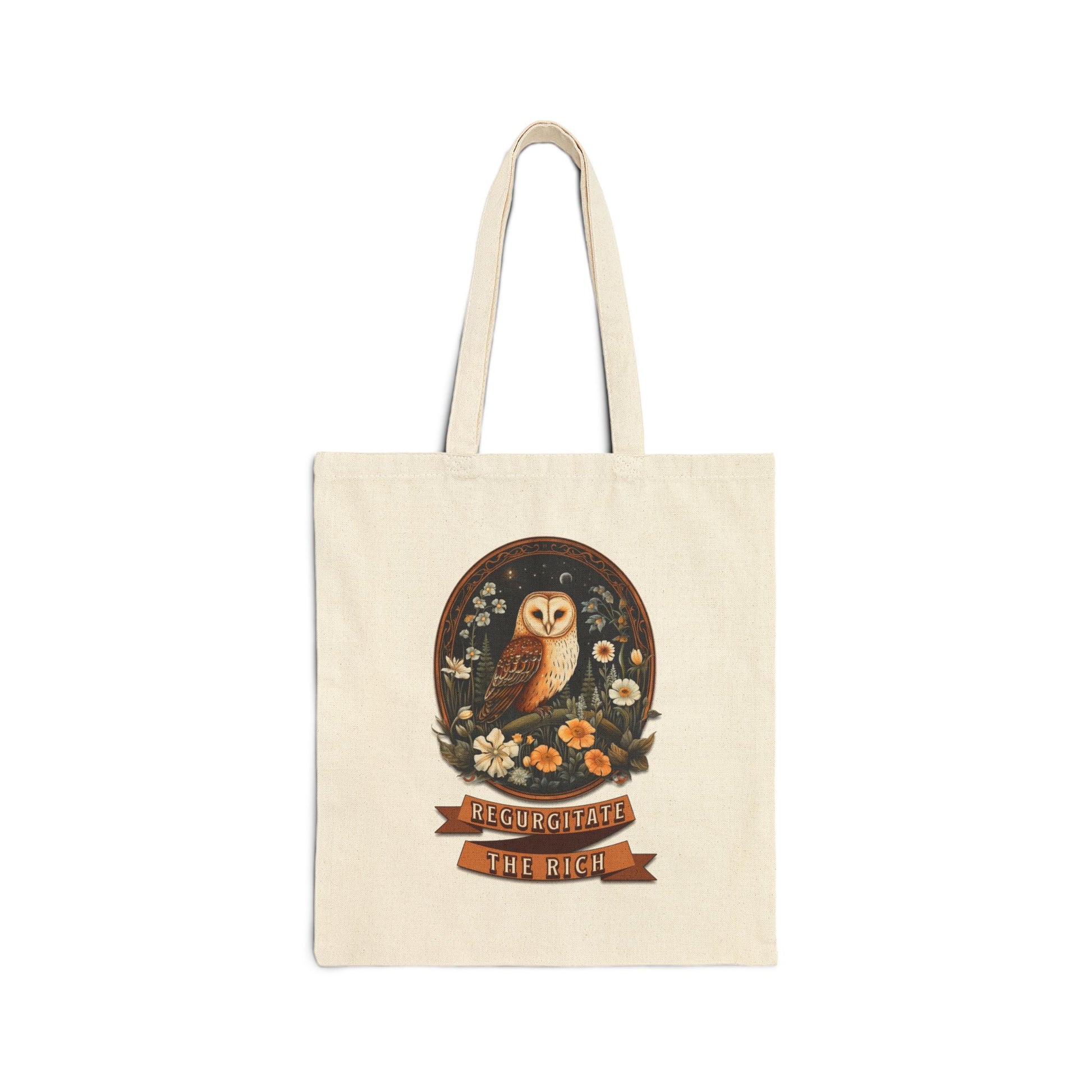 This tote features “Regurgitate The Rich” framed by a majestic owl and an oval floral crest — a folklore-inspired, cottagecore twist on the classic Eat the Rich sentiment. Gentle in appearance but unmistakable in message, it’s a carry-all for people who prefer their resistance wrapped in wildflowers and wisdom.