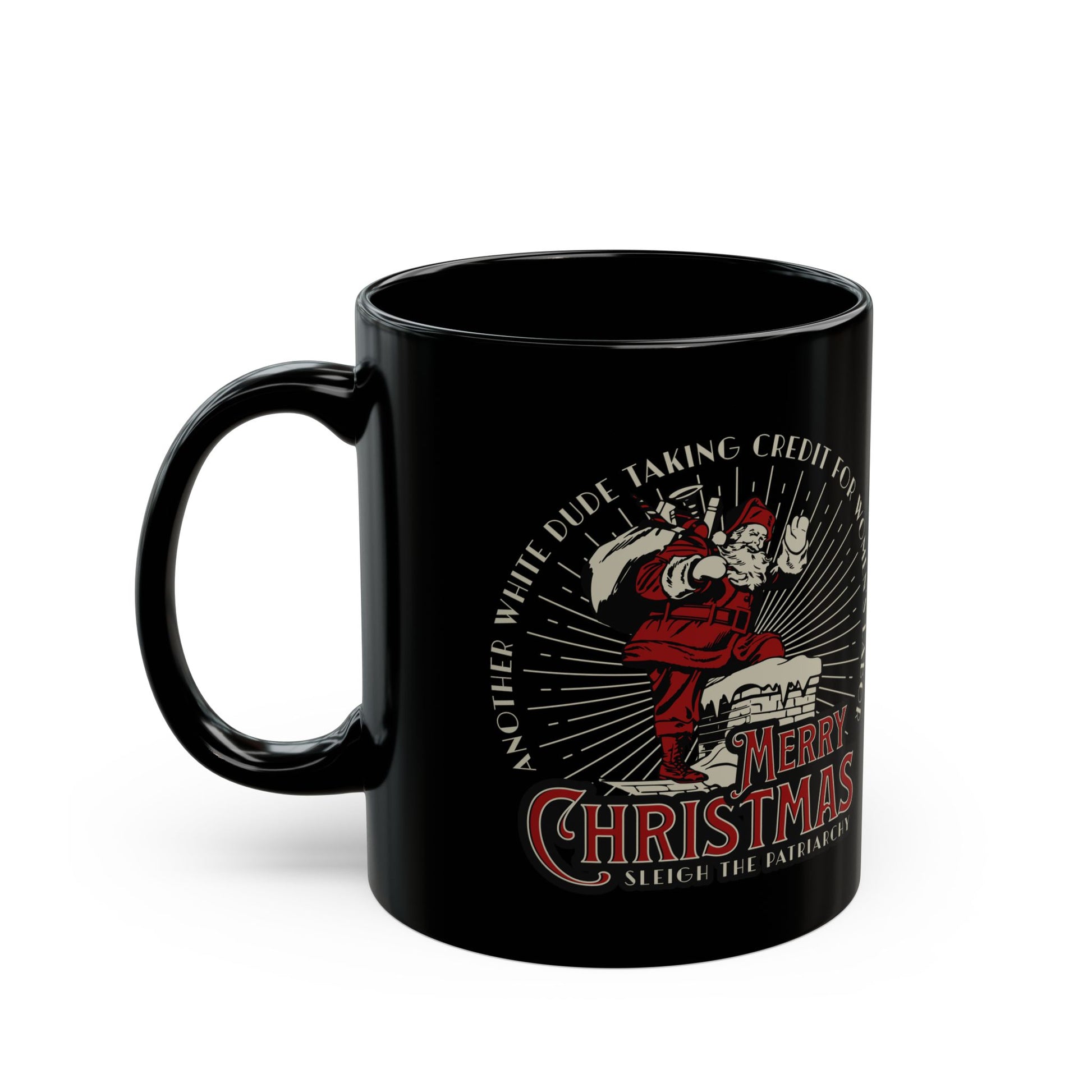 This mug features Santa on a snowy rooftop, mid–gift delivery, with the caption: