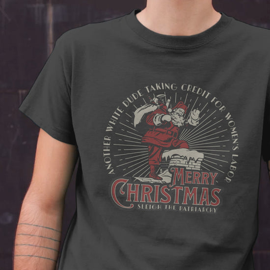 This shirt features Santa on a snowy rooftop, arms full of gifts, with the caption: