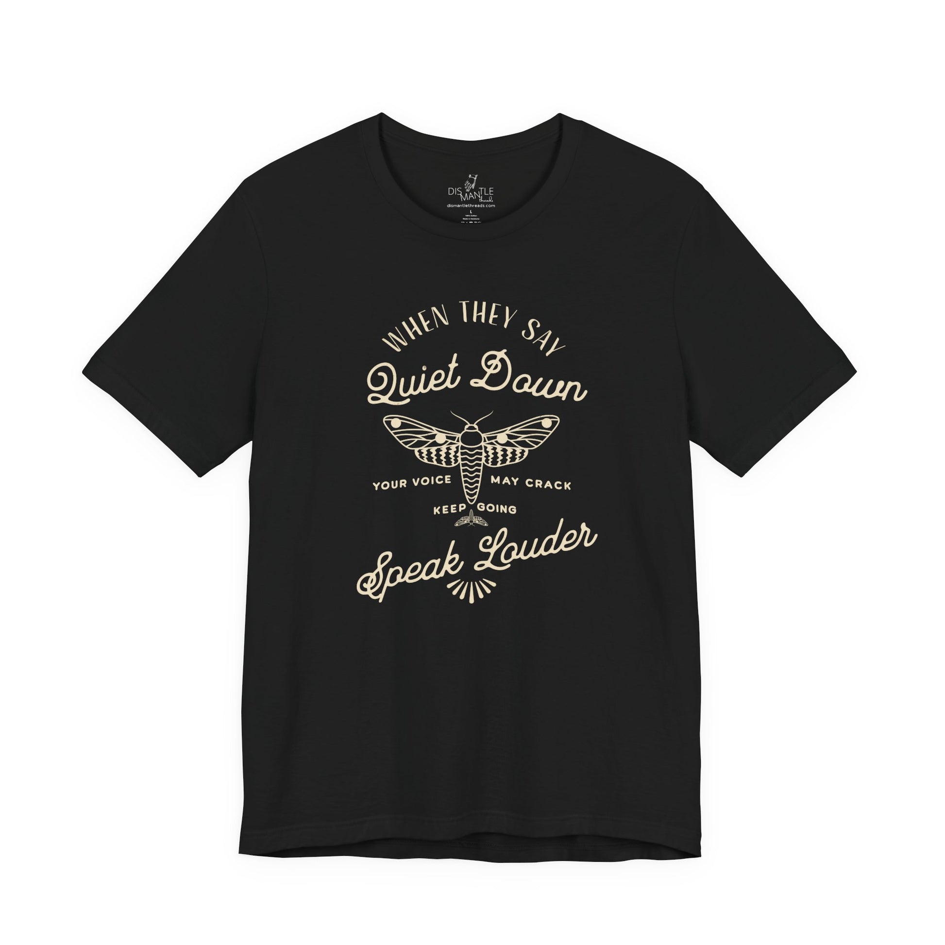 This unisex tee features the phrase “When They Say Quiet Down, Speak Louder” in vintage-inspired typography, paired with a resilient moth at the center of the artwork. Soft, durable, and made for everyday visibility, it’s a clear message for anyone who’s been pushed to the margins and told to stay silent. This shirt refuses that script.