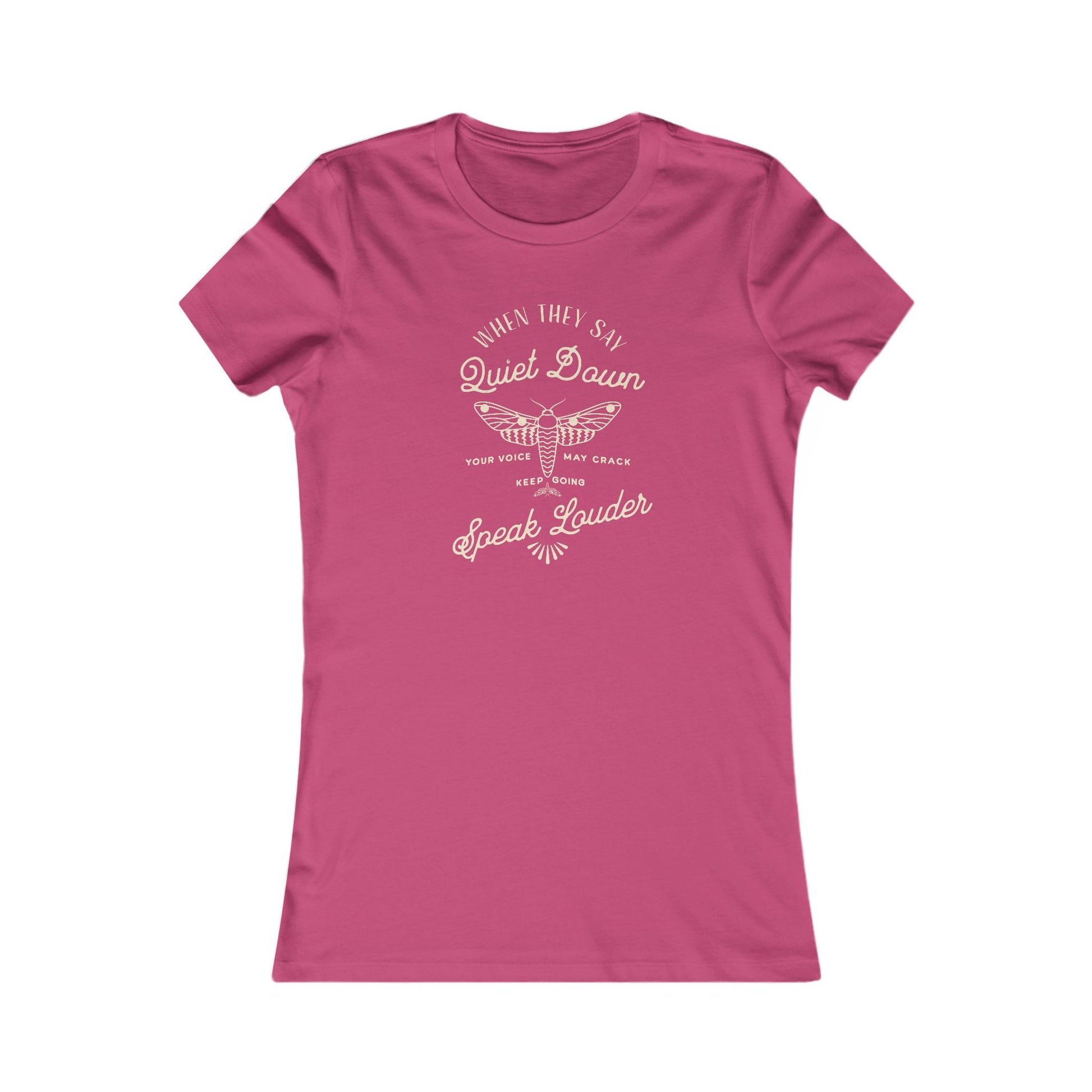 This women’s fitted tee features the phrase “When They Say Quiet Down, Speak Louder” in vintage-inspired lettering, anchored by a resilient moth at the center of the design. Soft, structured, and intentionally bold, it’s made for people who’ve been told to stay small — and decided to take up more space instead.