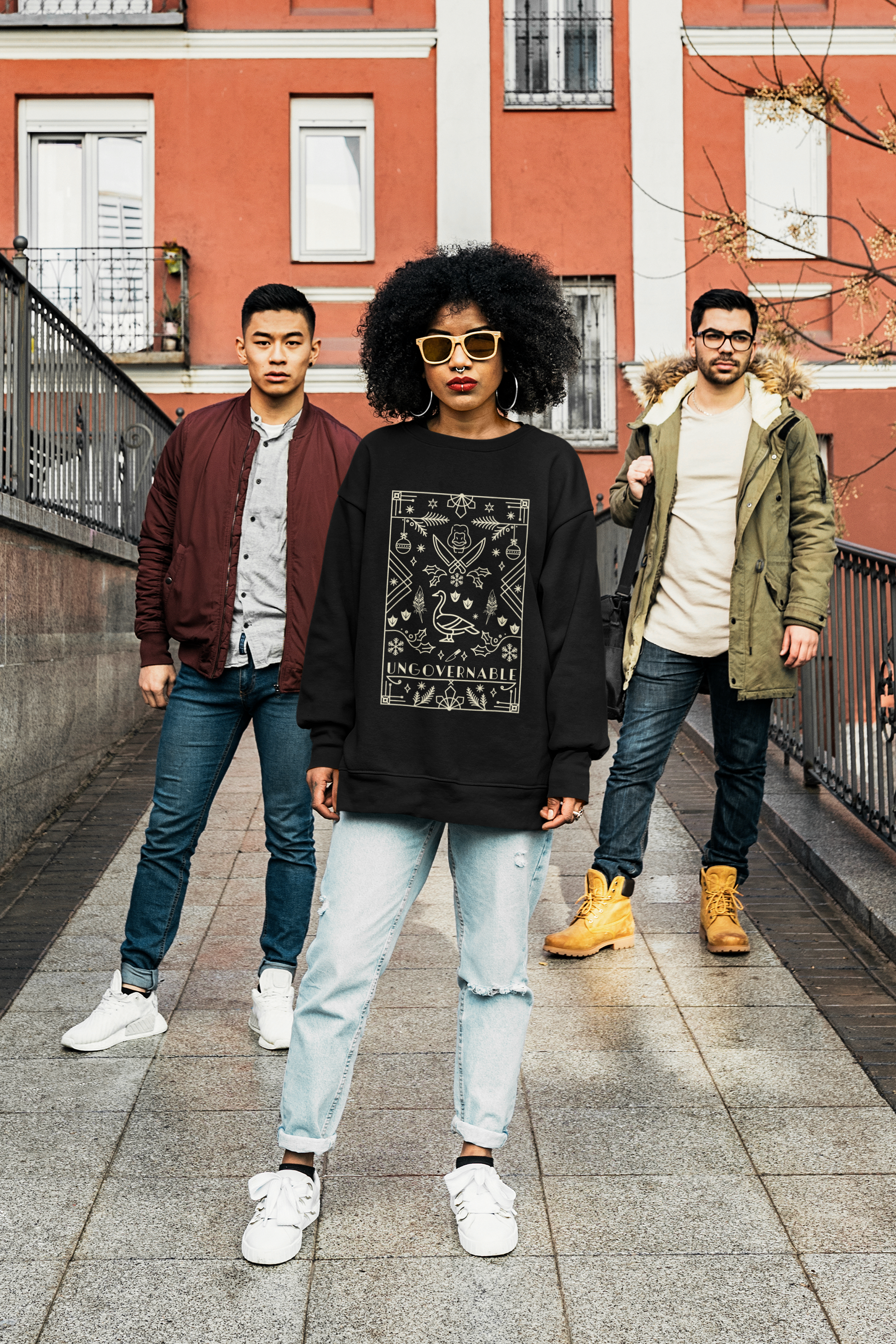 This unisex sweatshirt features the single word “Ungovernable” framed by an art-deco collage of winter symbols, geese, and blades — a beautifully absurd nod to the long tradition of geese as agents of chaos and unexpected rebellion. It’s festive only at first glance; look closer and it becomes a quiet indictment of holiday obedience culture.