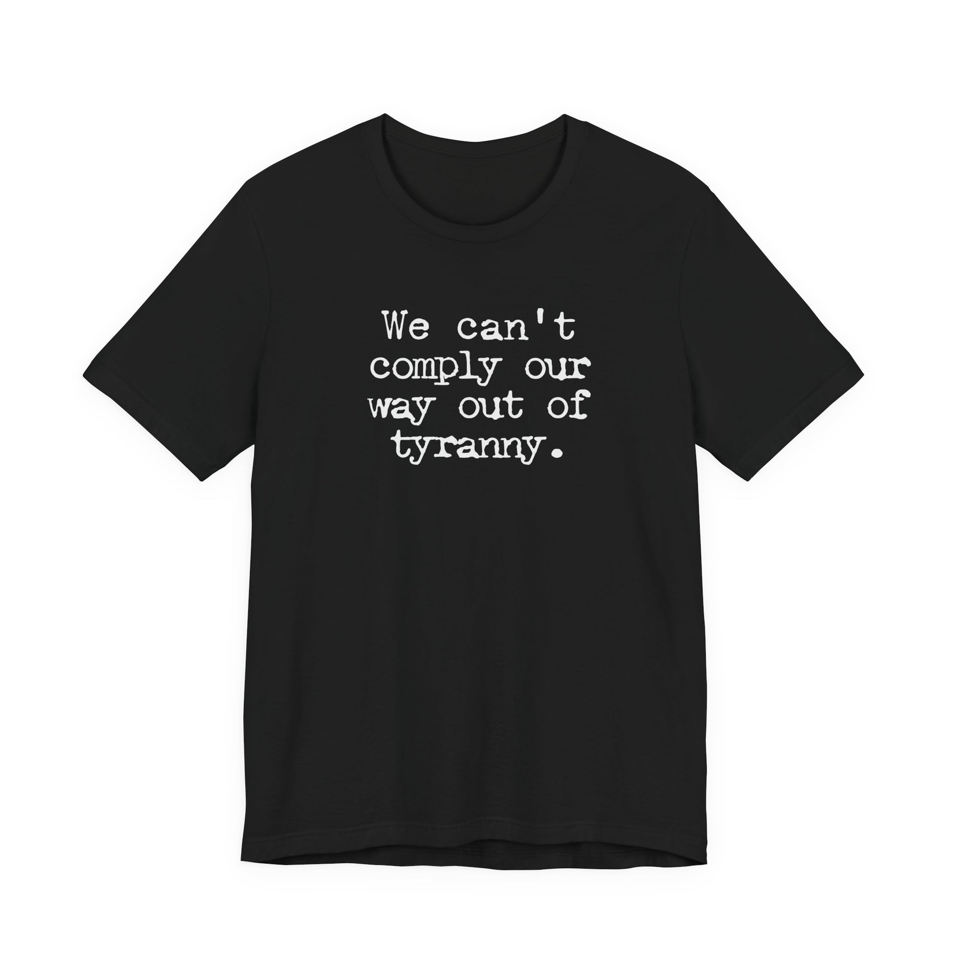 Black unisex protest tee with white typewriter-style text — designed for protests, strikes, direct action, mutual aid, and everyday political visibility. Compliance has never dismantled authoritarianism, capitalism, or state violence. Marxist theory, labor history, and anti-colonial struggle all agree on one point: you don’t negotiate oppression into being humane. You fight it, you disrupt it, you refuse it.