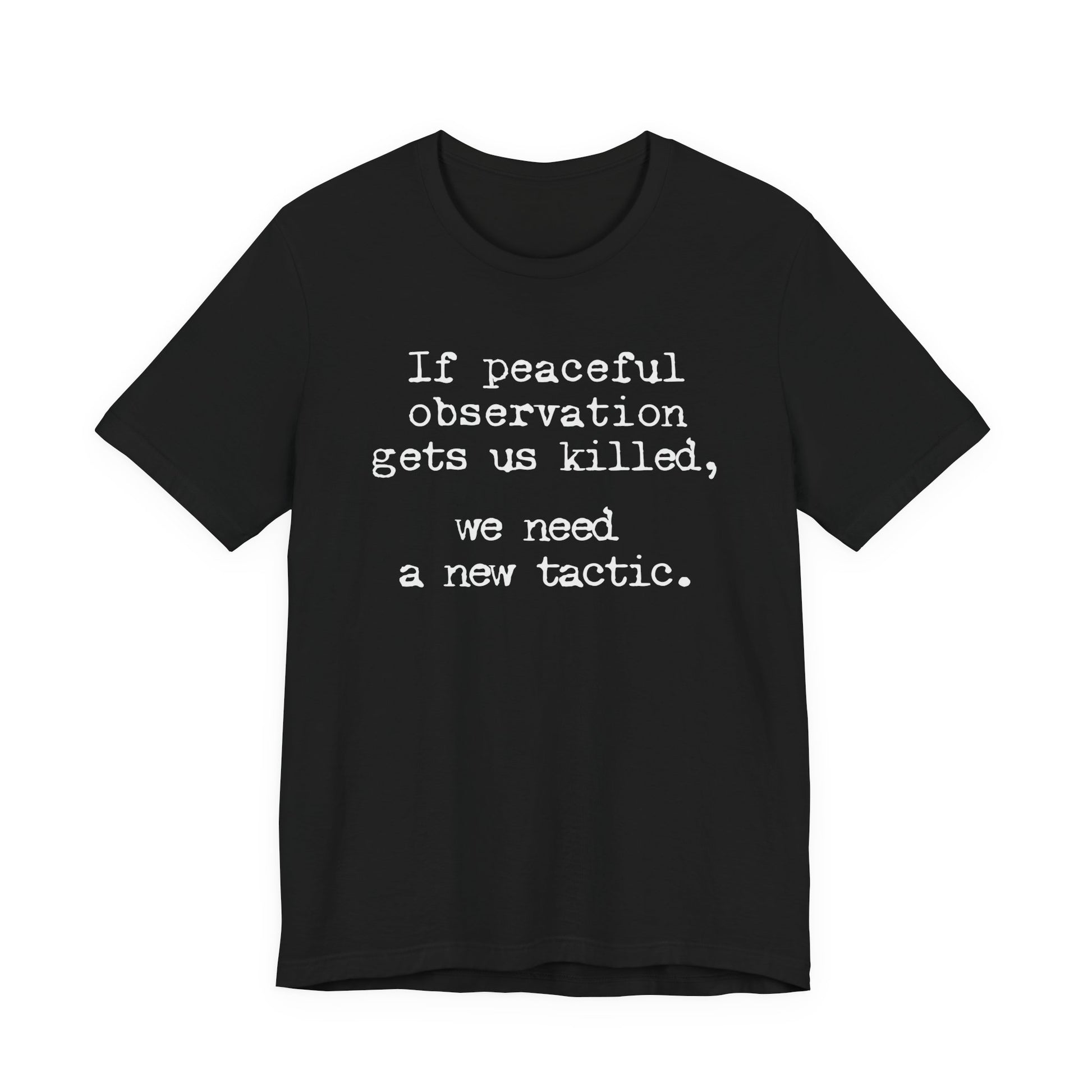 A protest shirt for organizers, activists, and community members who understand that passive observation, silence, and “peacefulness” are no longer considered protection — and sometimes never were.
